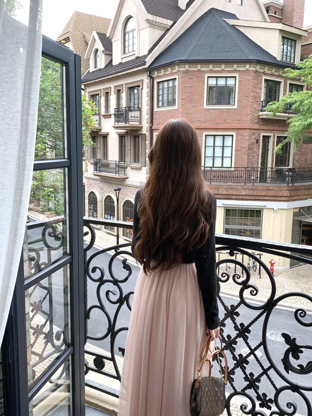 优雅坐楼梯,白裙飘飘,粉色高跟鞋,自然光下更显清新