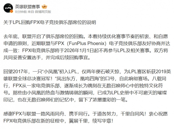 去年底,联盟开启了俱乐部席位的回购。本着持续优化赛事节奏的初衷、和自愿申请的原则,近期联盟与FPX(FunPlusPhoenix)电子竞技俱乐部友好协商并达成一致:FPX电竞俱乐部将于2026年1月1日起不再参与LPL及相关赛事。双方将共同妥善安置选手,并完成后续回购事宜。