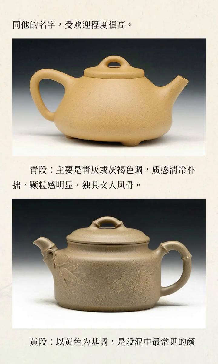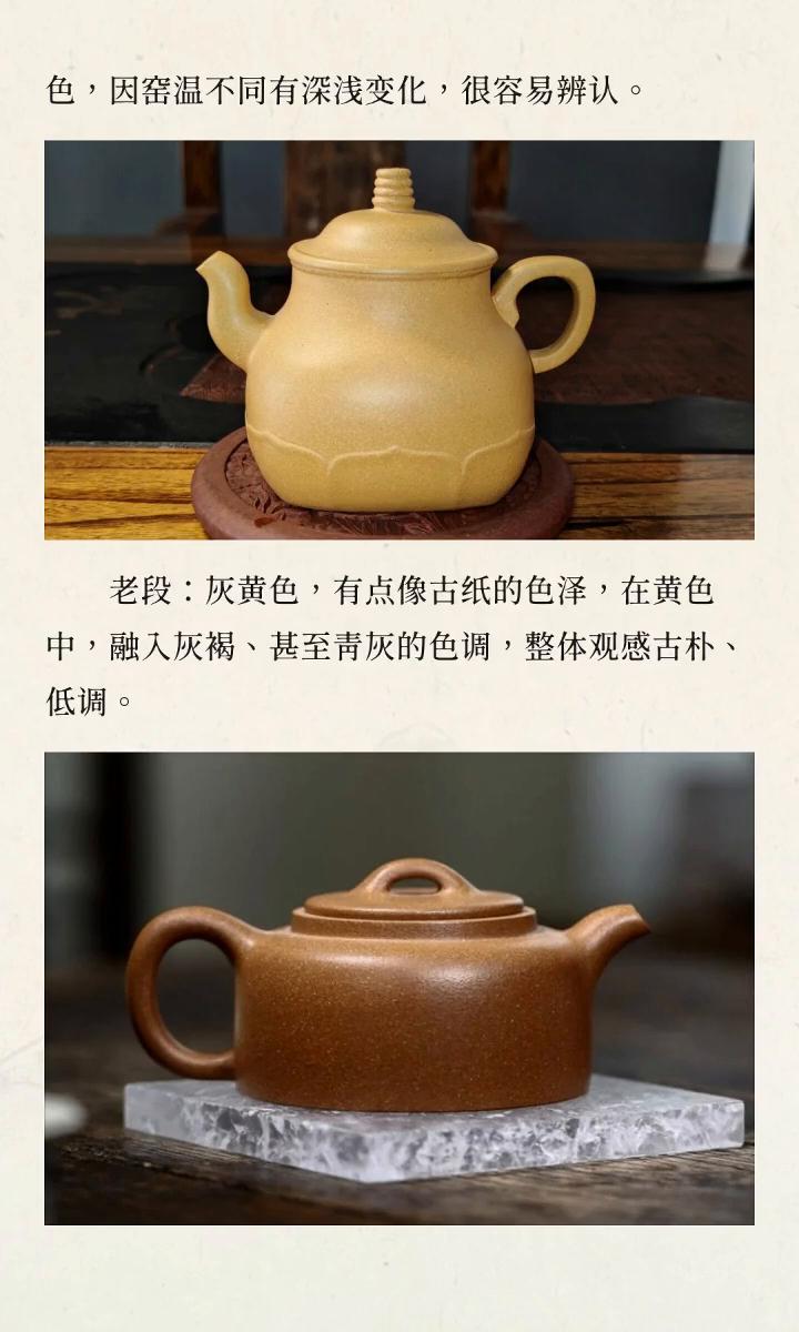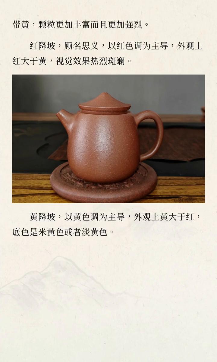 段泥系。 ·本山绿泥:基调是淡黄中微泛青绿,非常清雅恬淡,像早春的嫩芽。 ·黄金段:呈浅金黄色或明黄色,色泽鲜亮,如同它的名字,受欢迎程度很高。 ·青段:主要是青灰或灰褐色调,质感清冷朴拙,颗粒感明显,独具文人风骨。 ·黄段:以黄色为基调,是段泥中最常见的颜色,因窑温不同有深浅变化,很容易辨认。 ·老段:灰黄色,有点像古纸的色泽,在黄色中融入灰褐、甚至青灰的色调,整体观感古朴、低调。 段泥的颜色跨度也是比较大的,颜色最为丰富,也最容易让新手困惑。其实段泥的基调是黄色,如果一把段泥壶完全看不到黄色调,那么大概率也是有问题的。段泥壶颜色浅,如果想要保持这种浅淡的质感,那么就不要冲泡茶汤颜色深的茶类,通常来说颜色最浅淡的壶最能体验泡养过程中颜色变化的乐趣。 ·降坡泥:降坡泥大类可以归为段泥系,基本特征是红中带黄,颗粒更加丰富而且更加强烈。 →红降坡,顾名思义,以红色调为主导,外观上红大于黄,视觉效果热烈斑斓。 →黄降坡,以黄色调为主导,外观上黄大于红,底色是米黄色或者淡黄色。 红降坡相对来说比较容易分辨,但是黄降坡有可能会容易跟段泥混淆,主要是看颗粒。黄降坡相对于段泥,颗粒更鲜明,颗粒颜色也更丰富,而段泥的颗粒颜色更趋于一致。 所以,回到最初的问题。紫砂壶没有所谓最正宗的颜色,选壶时不必执着于寻找一个统一的色号,而是应该去学着欣赏这五色土天然造就的千变万化。然后,再以你的喜好,作为唯一的标准。