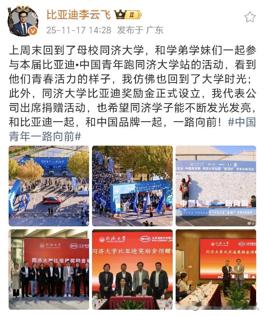 绷不住了! 要是比亚迪李云飞他自己不说出来,恐怕很少有人知道吧!万万没想到,比亚迪李云飞是同济大学的校友! 比亚迪的李云飞于2004年毕业于同济大学市场营销专业。毕业后同年7月便加入了比亚迪,从此开启了在比亚迪的职业生涯。 上周末李云飞回到了母校同济大学,和学弟学妹们一起参与本届比亚迪•中国青年跑同济大学站的活动。同济大学比亚迪奖励金正式设立,李云飞代表比亚迪参加了同济大学比亚迪奖励金捐赠仪式! 李云飞表示看到学弟学妹们青春活力的样子,自己仿佛也回到了大学时光。 中国品牌和中国顶尖高校的携手,一路向前!希望比亚迪和同济都能越来越好!
