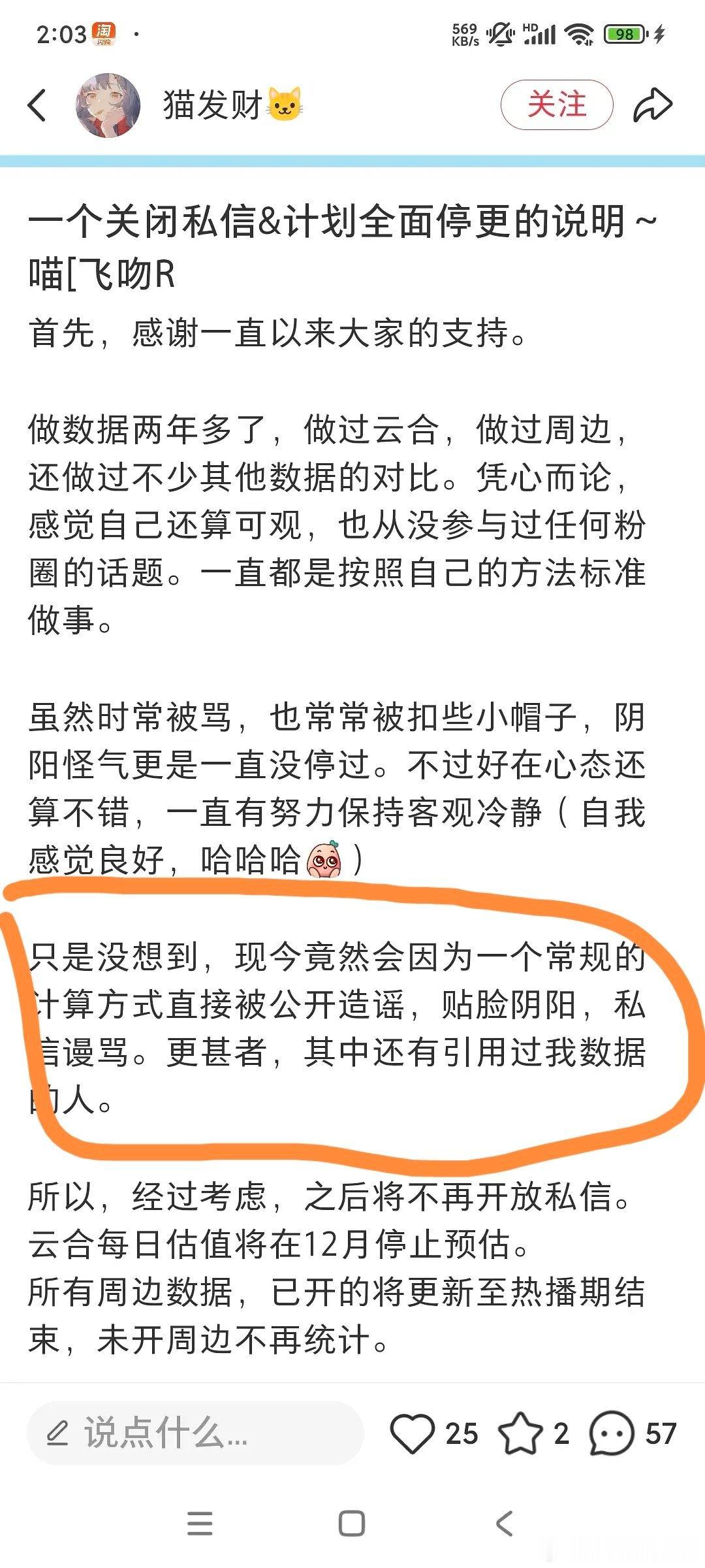 据说是因为猫发财估水龙吟周边的数据,妨碍ie后花园吹牛了,所以有人狙他,他受不了,声明停更了。