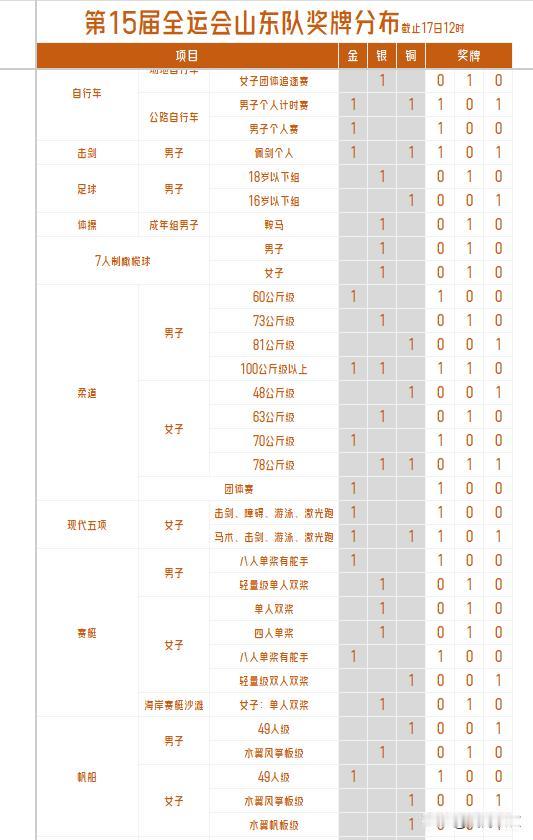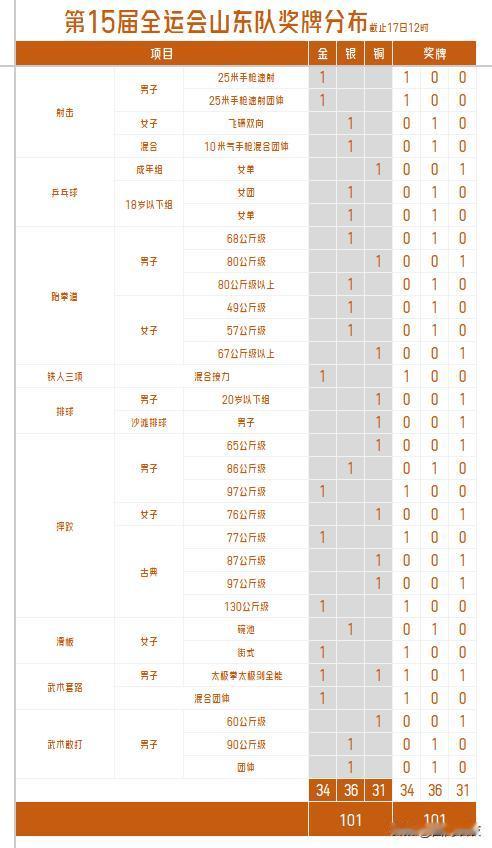 【三分钟速览!截止17日中午山东队斩获101枚奖牌项目分布!】 截至目前,山东健儿在全运会斩获34金36银31铜的佳绩。这些奖牌分布在27个大项中的94个小项目中。 其中,在男子800米自由泳、男子200米蝶泳、男子自行车个人计时赛、男子佩剑个人、男子柔道100公斤级以上、女子柔道78公斤级、现代五项女子传统、男子太极拳太极剑全能等八个项目中均斩获两枚奖牌。