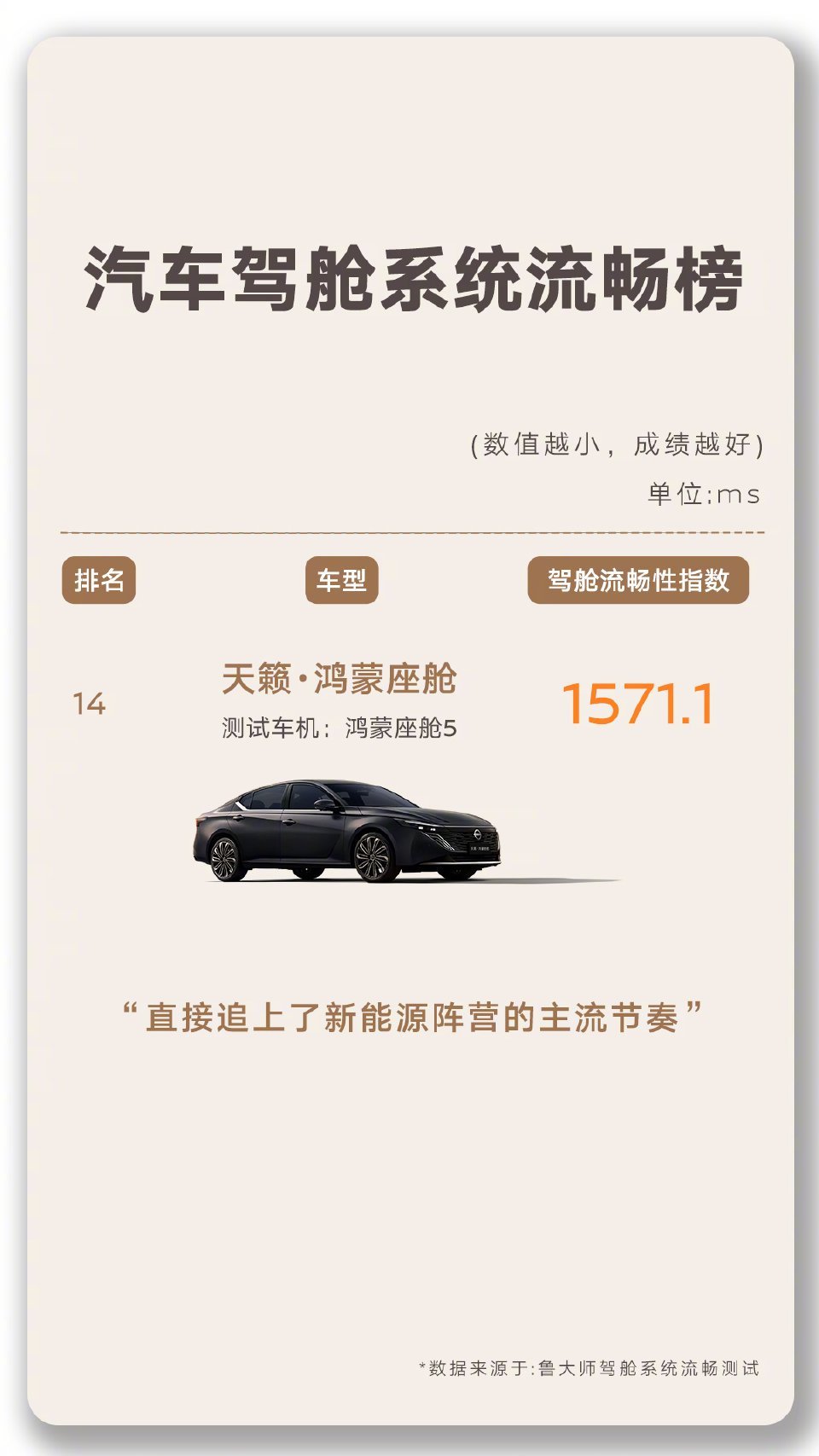 日产天籁搭载鸿蒙座舱后不仅仅补足了智能化短板,结合鲁大师实测数据和实际体验来看,日产天籁鸿蒙车机系统流畅度处于行业前列水平,其价值不仅体现在提升用户驾乘体验,更给新势力燃油车的智能化树立了标杆一是优化驾乘体验,毫秒级响应的AI语音助手支持四音区识别,可同时完成多项指令,跨设备流转功能让手机与车机的音乐、导航无缝衔接,还有48个原生精品应用,无需依赖手机;二是树立燃油车智能标杆,作为全球首款搭载鸿蒙座舱5的燃油车,它的表现超越绝大部分华为系车型,证明燃油车也能拥有媲美新能源车的智能体验,打破了“燃油车=不智能”的标签;三是强化产品竞争力,搭配豪车同源的HUAWEI SOUND音响等配置,让天籁在与凯美瑞、雅阁等同级别燃油车竞争时,凭借智能化形成差异化优势,也为新势力燃油车的车机升级提供了参考范本。