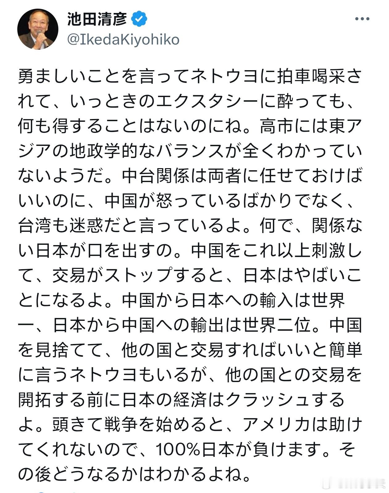 早稻田教授批高市早苗,称与中国开战100%必败根据《朝日新闻》的最新民调显示,高市的支持度不降反升,显示日本普遍民意也支持高市的态度,不过早稻田大学名誉教授池田清彦却逆风,批评高市的「台湾有事」言论。池田清彦16日在X上发文,直言高市根本不懂东亚的地缘政治平衡,中台关系交给双方自己处理就好了,现在不只中国很生气,连台湾也觉得困扰,为什么要插嘴跟日本无关的事呢?如果再这样刺激中国,导致贸易停滞,日本会变得很惨,虽然右翼说可以孤立中国,跟其他国家做生意就好,但在开展其他国家的贸易之前,日本经济就会崩盘了。池田清彦指出,若中国真一气之下开战,美国是不会来帮忙的,而日本100%会打败仗,「高市,你再不快点道歉的话,事态只会更加恶化喔!」