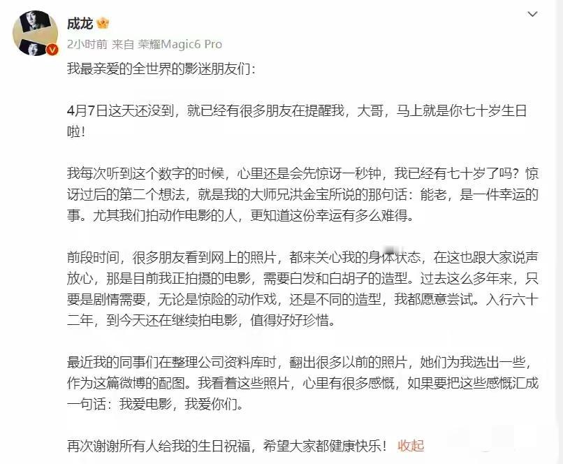 71岁成龙去世?成龙:我不知道死了多少回了!当事人回应了。 这娱乐圈真热闹,啥事都能遇到。 这样离谱的新闻,着实令人生气又唏嘘不已。。 难道有人嫌弃网络不热闹?非得制造一点热闹? ​有外网媒体报道,成龙因为旧伤复发,已经去世了。 这话说的还有鼻子有眼的,让人不得不相信。 我赶紧去看看成龙。 成龙在11月11日还邀请我们2026年1月1日,一起过家家看电影。 这外网是几个意思? 网友纷纷炸开了锅。 吓得成龙本人,也赶紧亲自出面回应,辟谣。 ​ ​有网友晒出成龙的近照,才70出头的年纪,已经头发花白、满脸憔悴。 这成龙也说了,这是因为角度的需要,啥都是化妆的结果。 ​成龙出来辟谣,自己过得很好,很充实,身体很健康,自己还拍了电影,邀请网友们一起看2036年的电影。 ​看看吧,这就是一个假新闻,有人博眼球的。 本来成龙活的好好的,这外媒居然给说死了,真不知道他们为啥这么不严谨。 ​这几年,成龙已经渐渐淡出娱乐圈,很少看见他拍电影或者电视剧。 或许70岁的成龙已经转为幕后。 成龙是我们喜欢的明星,曾经看着他的电影电视剧长大的。 我们当然​希望成龙好好的,继续做他喜欢的影视业,多拍有质量的片子,多陪我们几十年。 外媒的​媒体们还是少造谣吧。 成龙出来辟谣说:我爱电影,我爱你们。 一句话,说明了一切,我爱电影,我还好好活着,正在拍电影。