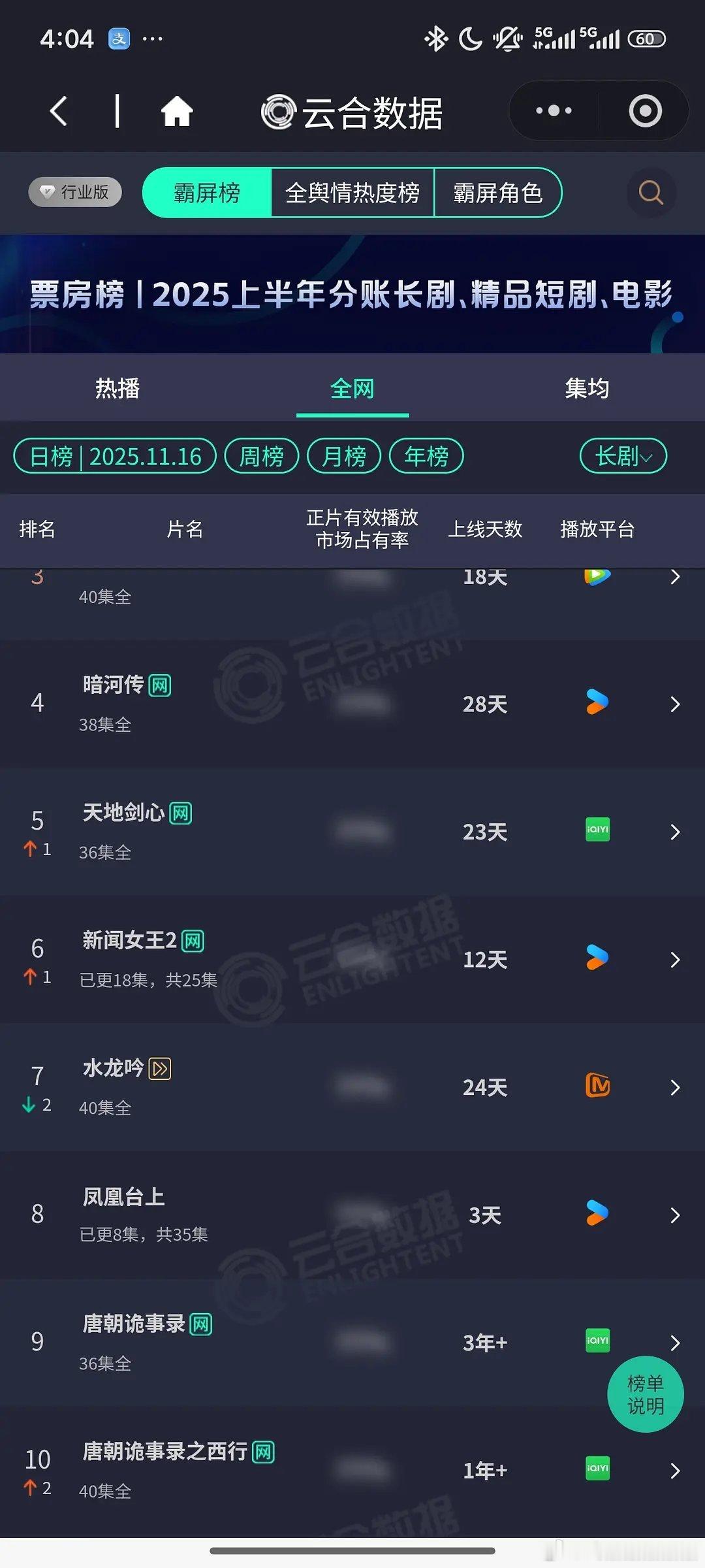 第四个案子口碑非常好,云合创新高。11.16 云合 唐诡28%, 唐诡系列云合前十占三。