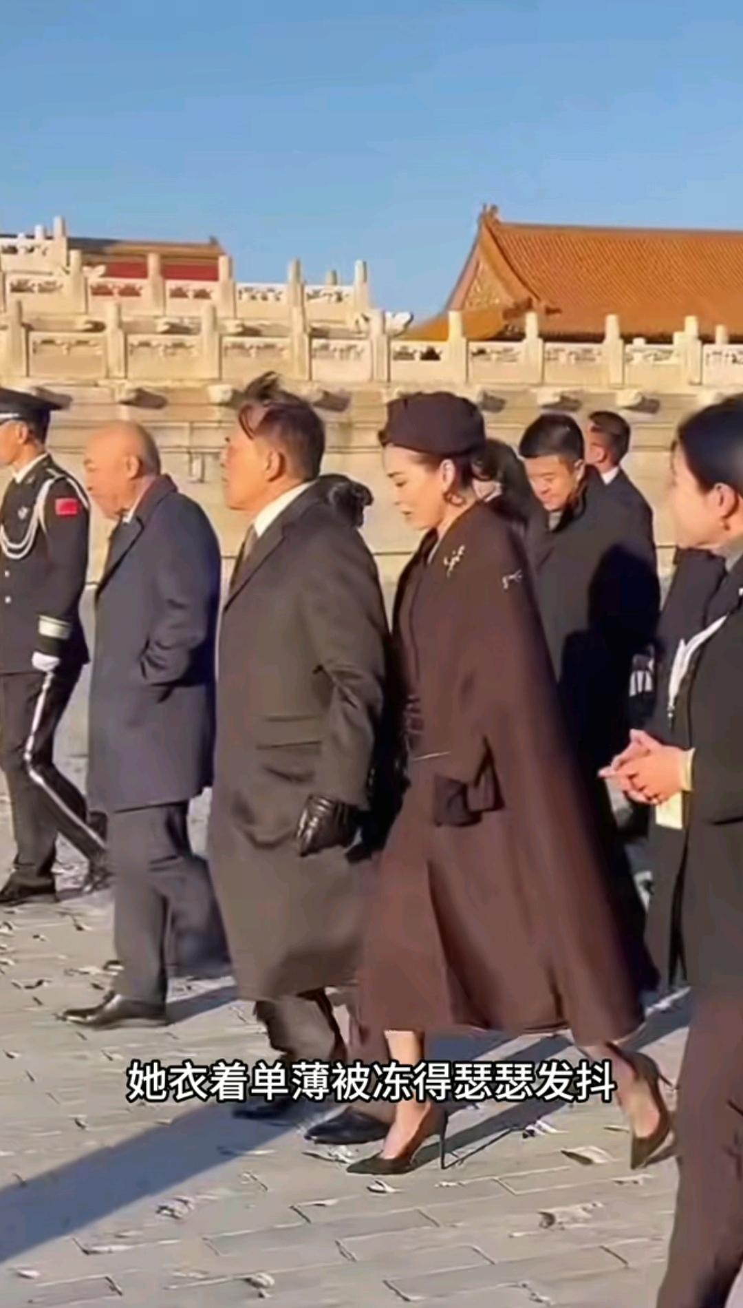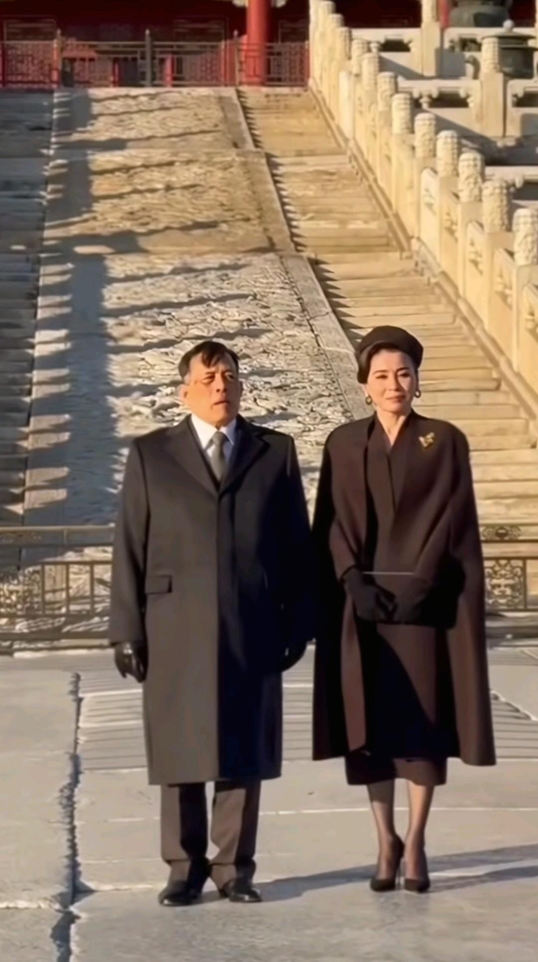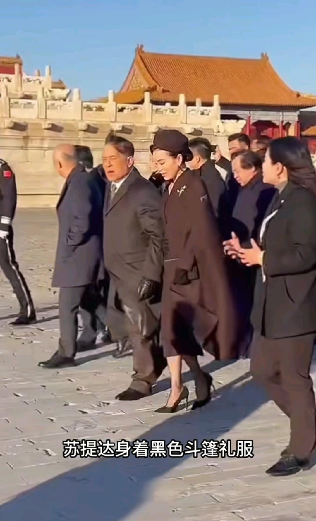 11月17日,苏提达陪着泰王去了北京故宫了,北京的天气寒风凛冽,苏提达换了一身新造型。 苏提达穿着黑色套装裙式大衣,戴着黑色皮手套和一顶黑色帽子,双手拿着黑色包包,穿着黑色高跟鞋和丝袜。 有一位女讲解员穿着黑色短款外大衣,在苏提达旁边认真讲解,苏提达边走边认真听。 苏提达冒着寒风参观故宫,穿的也比较少,两人在故宫里拍了合照。尽管天气寒冷,苏提达在这种场合依然注重自己的形象,踩着恨天高。