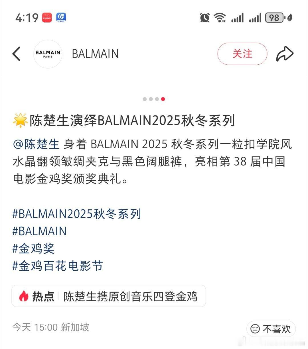 Balmain认领了。陈楚生身着 BALMAIN 2025秋冬系列一粒扣学院风水晶翻领皱绸夹克与黑色阔腿裤,亮相第38届中国电影金鸡奖颁奖典礼。生哥身材好、气质好,业务能力好,满分!