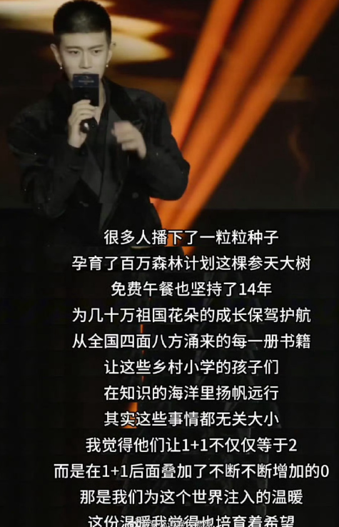 凭借多年深耕公益的坚守,任嘉伦斩获 “年度杰出慈善人物奖”。领奖时,他全程脱稿发表4分30秒慈善主题演讲,被赞“真挚动人,展现文化自信”。他承诺 “善用影响力传递慈善温度”,推动公益成为“触手可及的温暖”。站在国际舞台,他更希望 “让公益声音跨越国界,让行动穿透语言”,并重申 “慈善没有终点” 的信念。