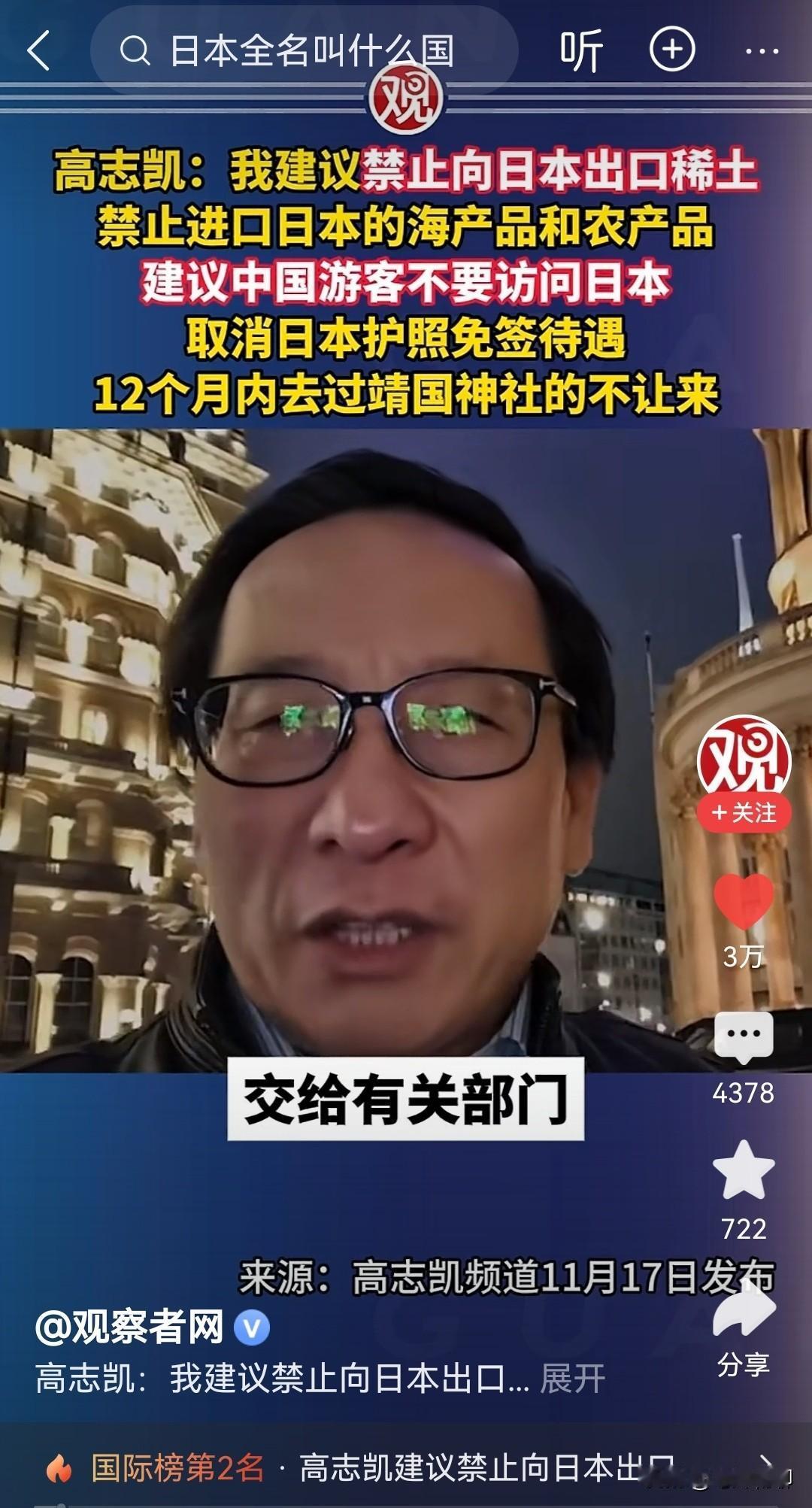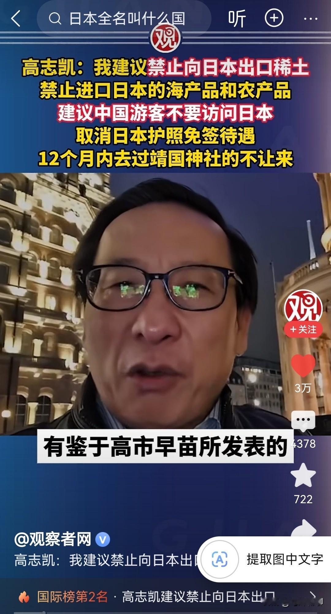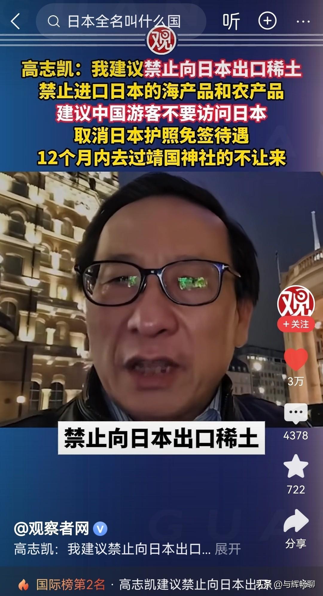 今天刷到高志凯教授为国家建言献策的视频,感觉他的观点恳切务实,且可行性极强。这些举措如果都能落地,那么会对日本当前嚣张气焰形成有力的打击,远比咱们口头谴责或说几句狠话更有实效。现将高教授的建议整理如下: 1. 禁止向日本出口稀土; 2. 全面暂停进口日本海产品; 3. 暂停进口日本农产品; 4. 禁止向日本出口中国农产品; 5. 暂停中国公民赴日旅游及访问活动; 6. 取消日本护照持有者赴华免签待遇,签证申请时需附加“一年内是否曾前往靖国神社”的申报及核查要求。 (图片来自网络) 最近中国公民在日本的安全形势如何 中国游客不前往日本旅游有何影响 日本航空自卫队的现状如何 中日关系未来发展趋势如何 日本旅游业将如何应对中国游客减少 在日本如何保护好自己的人身安全