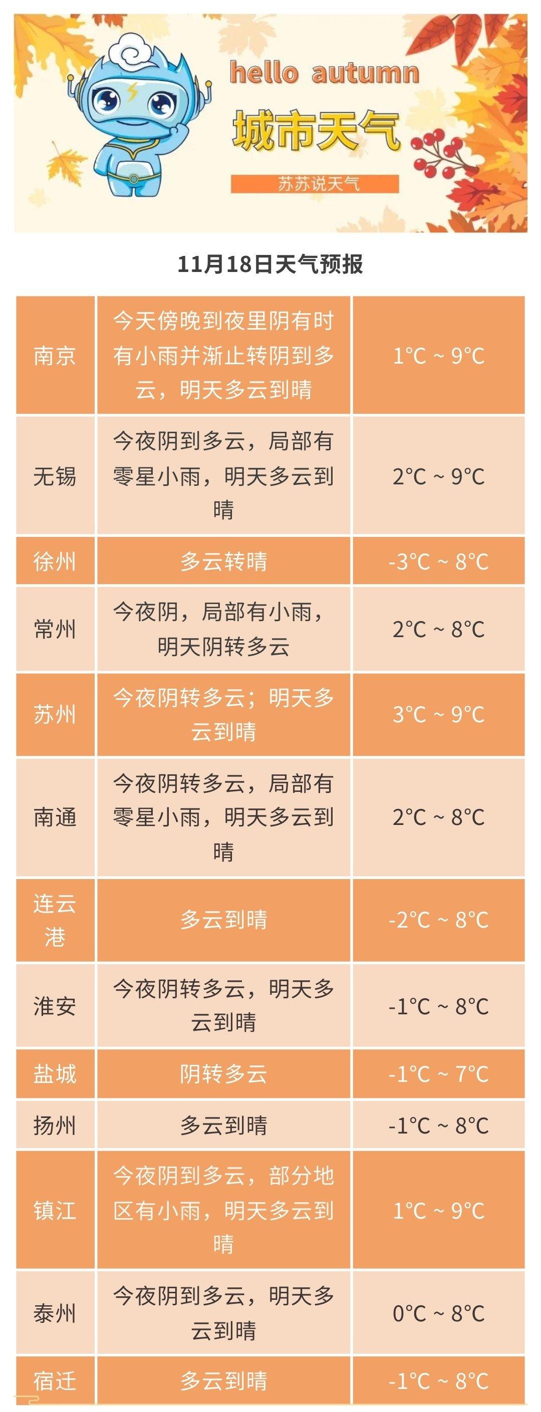 城市天气今天夜里苏南南部地区阴有时有小雨转阴到多云,其他地区多云到晴;明天白天全省晴到少云。具体城市预报如下:穿冬天的衣服很累