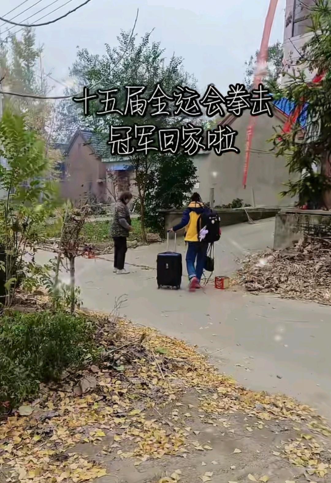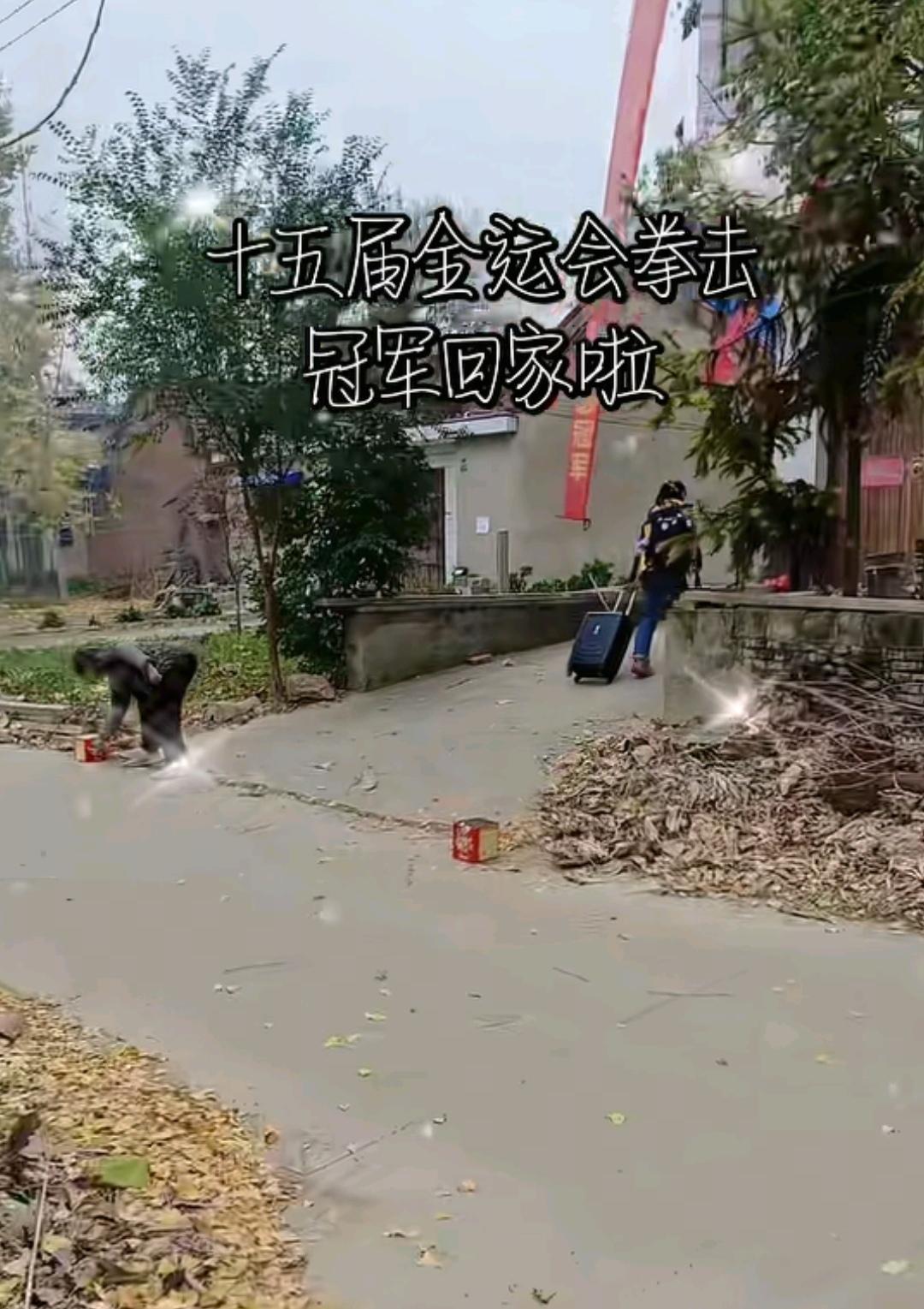 许紫春在夺冠6天后悄悄赶回江苏老家了,没有同行者,她穿着朴素,背着双肩包,右手提着小包,左手拉着行李箱就往回家跑。 有趣的是,许紫春的妈妈见到她后,没有帮着去拿行李,而是忙着放爆竹,许紫春的妈妈在家门口放了两个炮竹,用点炮竹的方式庆祝女儿夺冠,点了炮竹后,撒腿就跑。 另外,许紫春家的几层楼上也悬挂了横幅庆祝她夺冠。