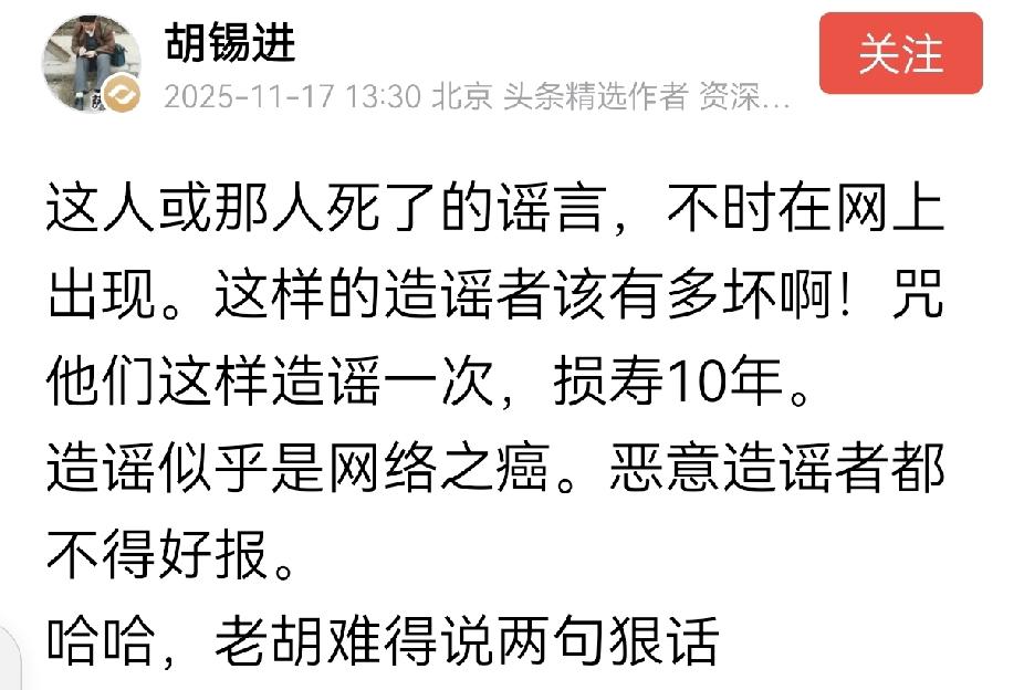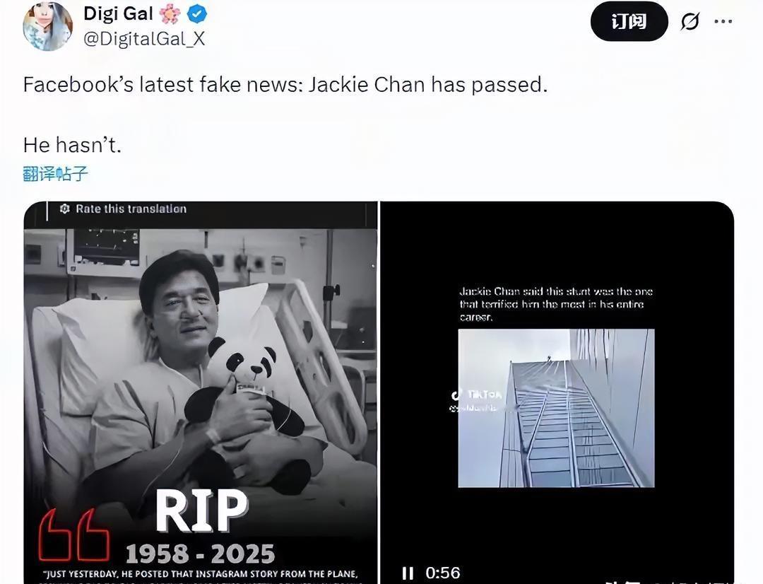AI谣言把成龙"杀"得措手不及 老胡这次真急眼了!指着AI生成的"成龙去世"假新闻大骂"咒人造谣该遭天谴"。可谁能想到,这位用真功夫打遍全球的大哥,竟被AI换脸技术"杀"得措手不及? 外网疯传的"成龙因伤病去世"帖子,配图里的白发老人是他新片造型。就像去年我爸被P成"病危通知书"诈骗,骗子连他刚染的白发都照搬。这些AI造谣者比编剧还会编——2015年说心脏病,2019年传中风,这次直接升级成"并发症去世",连追悼会日期都编得有鼻子有眼。 成龙上个月还在直播间教打太极拳,说"老骨头还能再拍十年"。结果AI造谣者连查证都省了,直接把电影造型当遗照。这让我想起小区王大爷,去年被造谣"跳广场舞猝死",气得他天天在谣言发源地打八段锦。 老话说"谣言止于智者",可AI时代谣言插上翅膀。就像《流浪地球》里的数字生命,造谣者动动手指就能让明星"死而复生"。这次成龙用新片花絮自证清白,下次呢?我们该怎么分辨屏幕里的"活人"是真实存在,还是算法捏出来的鬼魂? 你收到过AI造谣的假消息吗?评论区说说那些离谱的谣言套路。