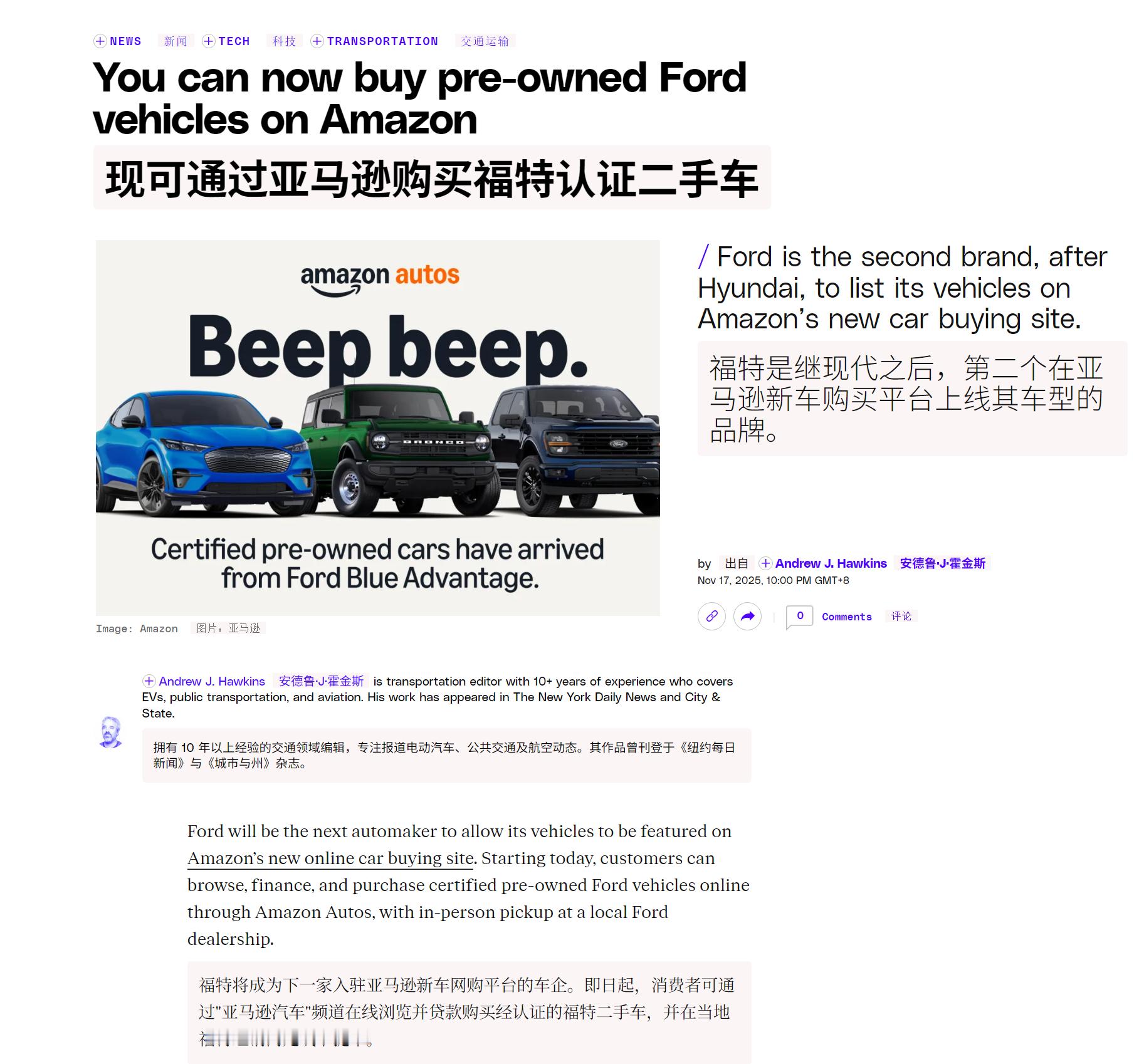 🔻福特汽车与亚马逊达成协议,将在美国亚马逊网站直接销售认证二手车。