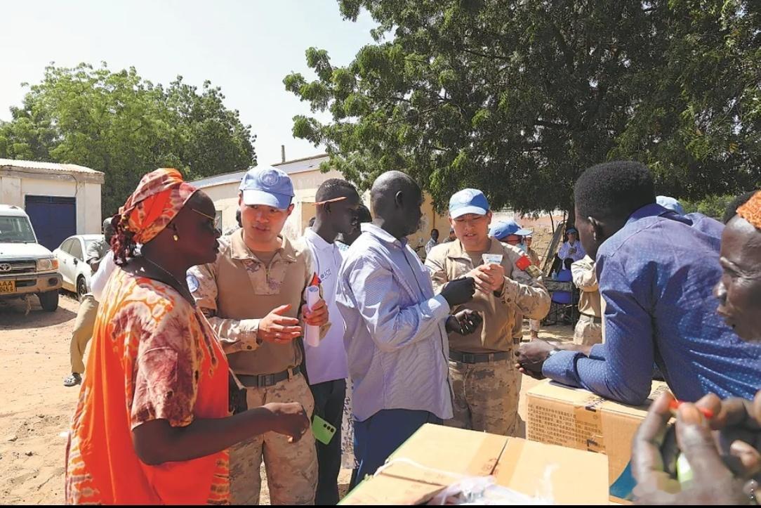 我赴阿卜耶伊维和快反分队和直升机分队医护人员在任务区平民医院开展义诊活动近日,我赴阿卜耶伊维和快反分队和直升机分队医护人员在任务区平民医院开展义诊活动,为当地民众提供免费诊疗服务,并向医院捐赠医用物资。图为医用物资交接现场。(中国军号)