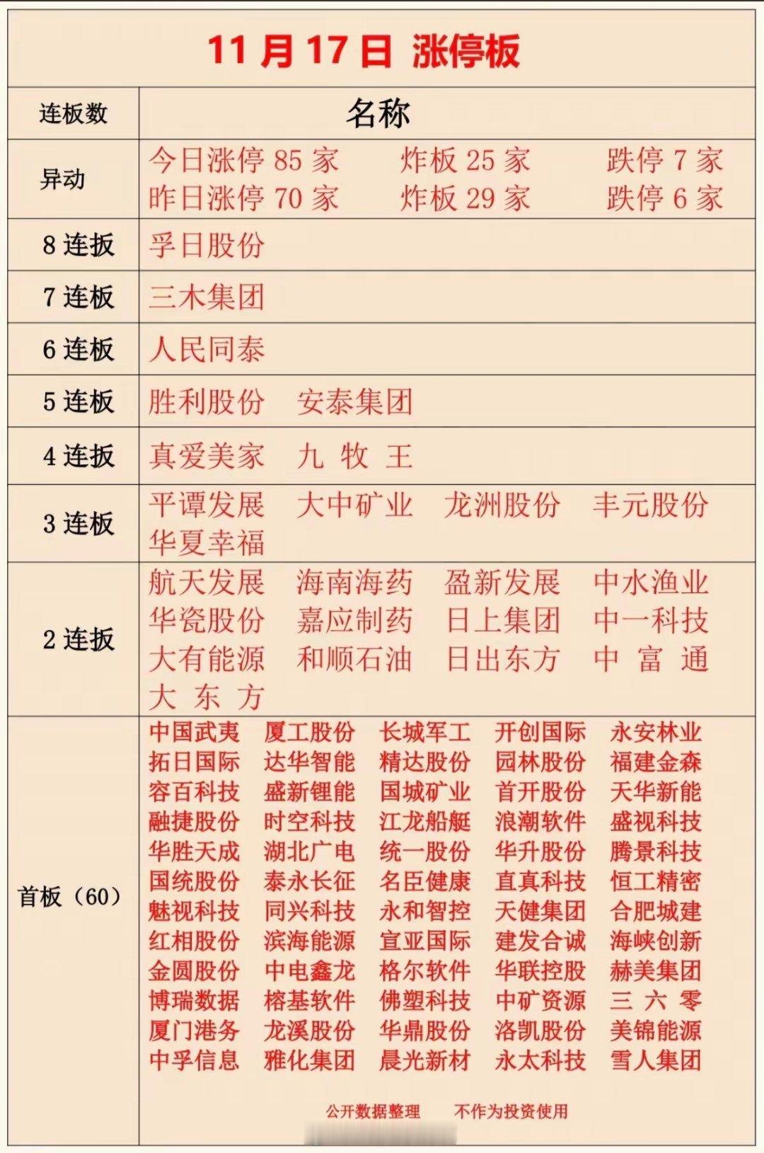 11.17周一 涨停板股票:题材+连板!今日涨停85家 炸板25家 跌停7家昨日涨停70家 炸板29家 跌停6家8连板 孚日股份7连板 三木集团6连板 人民同泰5连板 胜利股份 安泰集团4连板 真爱美家 九牧王