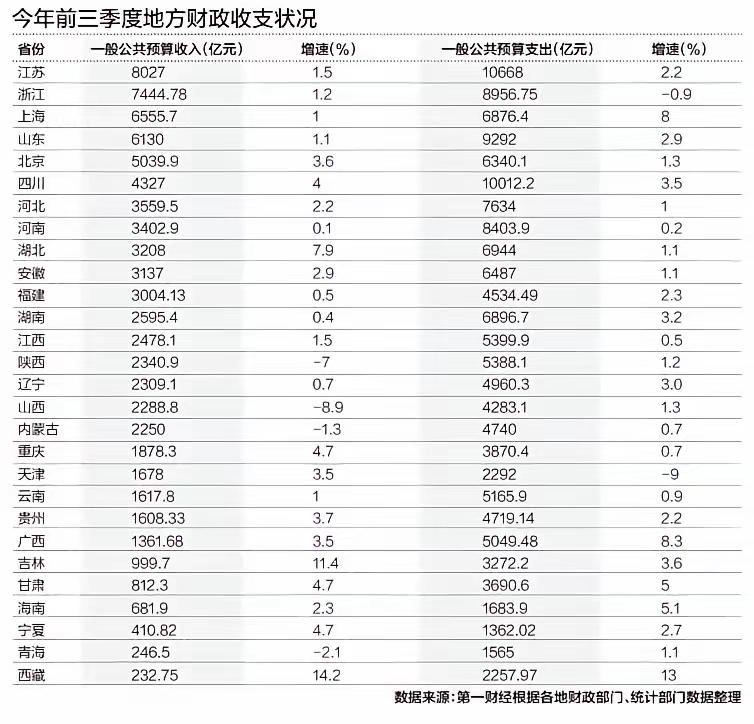 省份 财经 无广东,江苏称大王!28省份的前三季度财政收支发布,江苏8027亿,增速1.5%。浙江7444亿,增速1.2%。上海6555亿,增速1%,为前三名。而北方第一大省山东6130亿,增速1.1%,现为第四名,要是广东数据出来,山东会退一位的。 查一下豆包,2025年前三季度广东省一般公共预算收入为10342亿元,名义增长率3%,稳居全国各省份首位。是经济四大强省表达最牛气的。 江苏13个市前三季度财政收入均是正增长,苏州、南京己过千亿元。老徐数据未出来,预测在420亿左右,苏北五市第一不在话下了。 江苏 广东 山东 南京 苏州