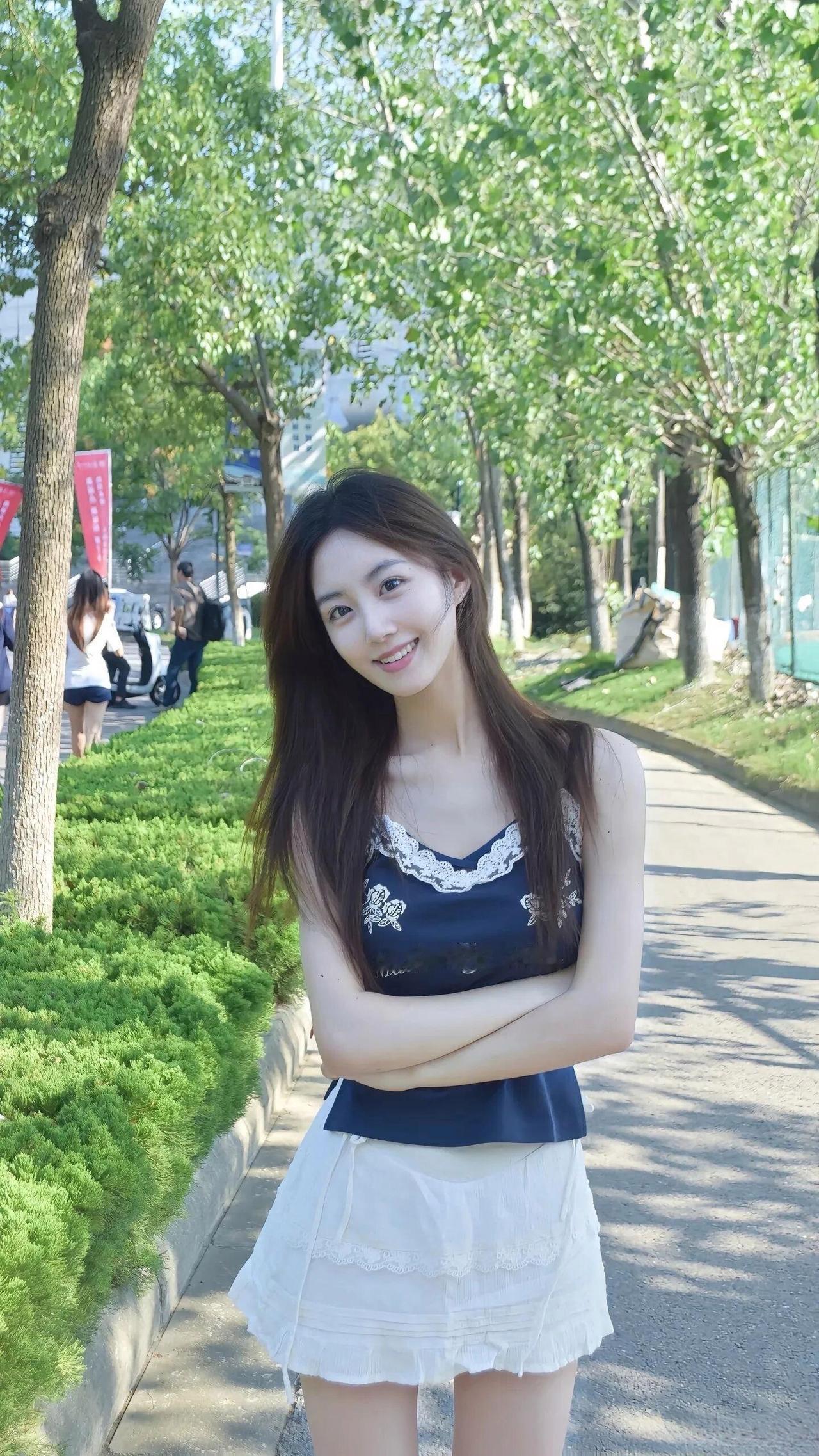 阳光明媚的午后,少女漫步在绿树成荫的小路上,微笑如花绽放。