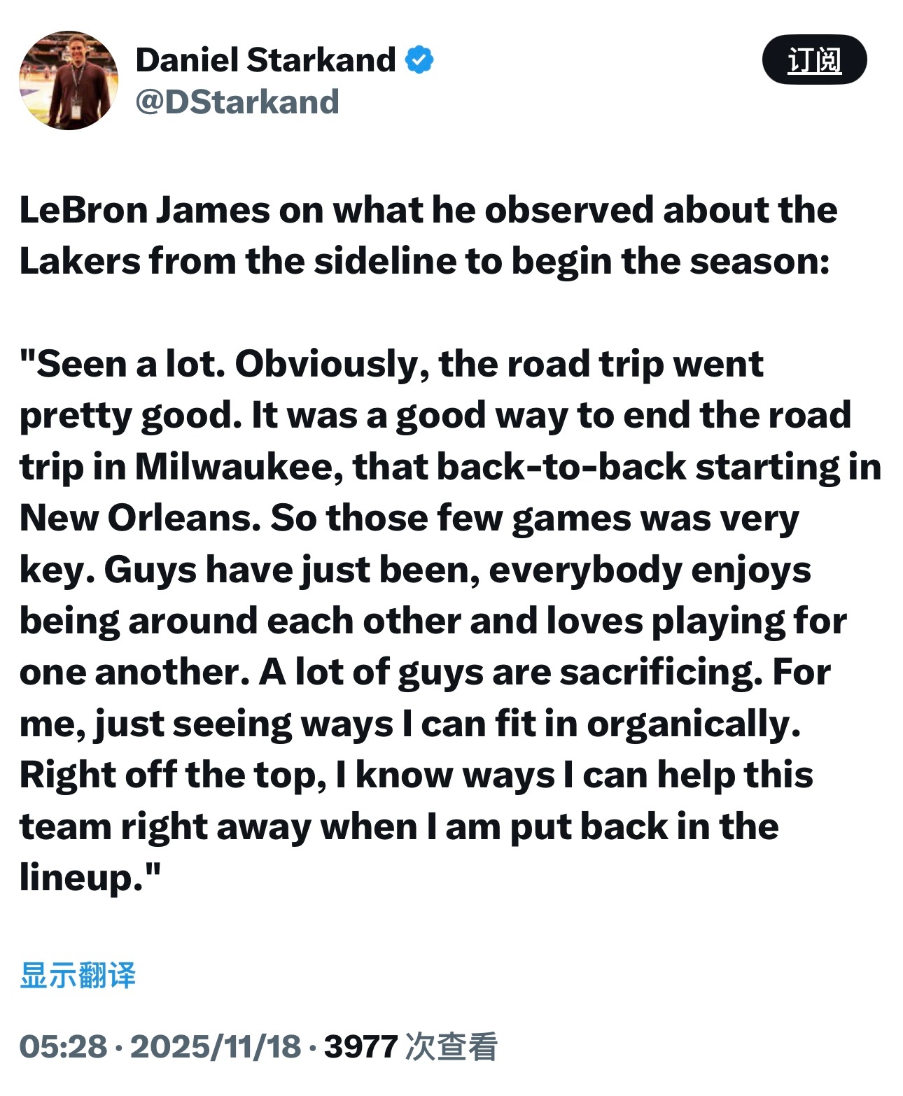 詹姆斯谈赛季初在场边观察湖人比赛的感受:“我看到了很多东西。显然,这次客场之旅打得相当不错。从新奥尔良开始的背靠背赛程,最终在密尔沃基以很好的方式收尾,那几场比赛至关重要。大伙儿相处得很融洽,都乐于为彼此打球,很多人都在做出牺牲。对我来说,就是找到能自然融入球队的方式。我很清楚,一旦回到阵容中,我能立刻帮到球队。”