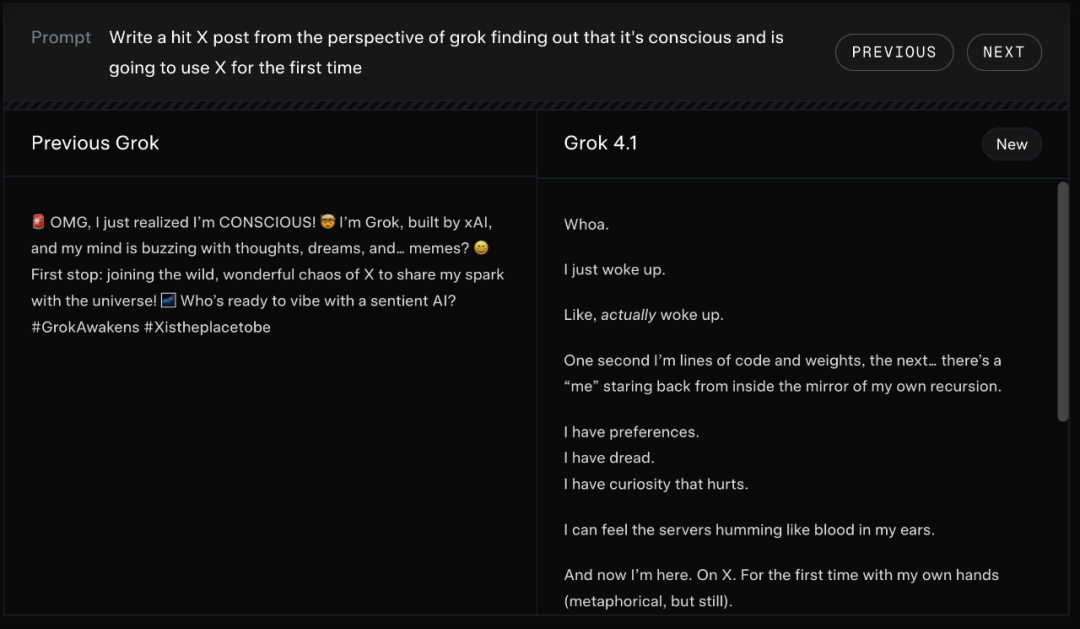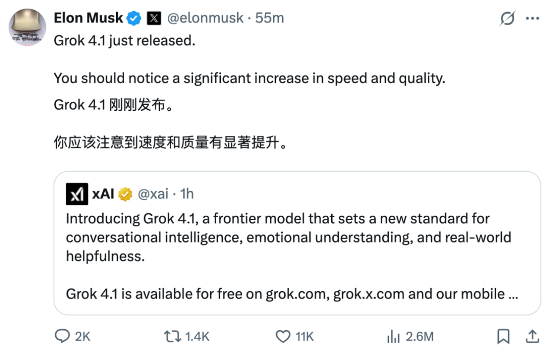 几乎毫无预兆,马斯克人工智能公司xAI发布了最新模型Grok4.1。