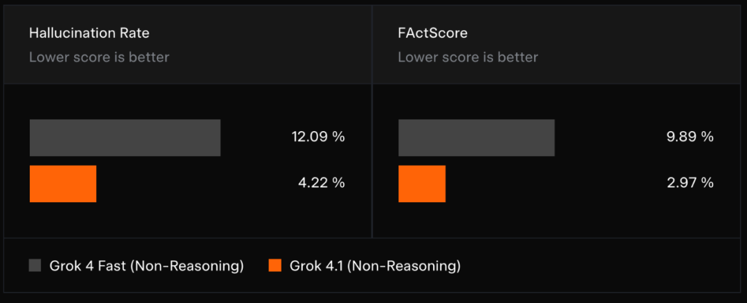 在Grok4.1的后训练过程中,xAI着重降低了信息查询类提示的事实幻觉。随后,xAI在抽样的生产环境信息查询提示中观察到了幻觉率的显著下降。