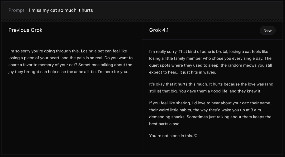 以下示例展示了Grok4.1对情绪类提示的回应方式: