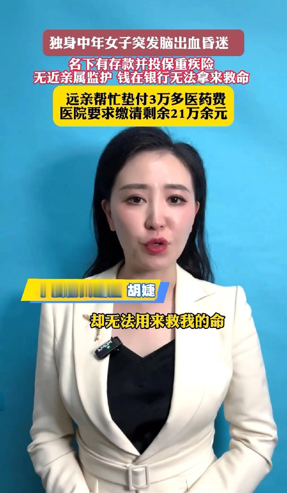 “我有钱,却不能用来救命!”上海,46岁的独身女子突发脑溢血住院,因病情严重,一直昏迷,由于女子父母双亡,没结婚,也没有儿女,甚至连近亲属都没有,一直无法动用自己的存款救命!远亲帮忙垫付3万多医药费,医院要求缴清剩余21万余元,银行却拒绝支付,保险公司也拒赔。 (来源:小强热线) 今年10月14日,上海46岁的蒋女士给公司发了条请假信息,说自己头晕得没法动,谁也没想到这会是一场危及生命的意外。 同事放心不下上门查看,一推开门就见蒋女士瘫在地上,赶紧把她送到了新华医院,诊断结果是脑出血,必须马上手术。 手术需要家属签字,可蒋女士一辈子没结婚,没孩子,父母早就过世了,远在兰州的姑姑今年4月也走了,舅舅三十岁左右就不在了,身边连个近亲属都没有。 最后大家好不容易联系上远房亲戚吴先生——蒋女士的父亲是吴先生爷爷的姐姐的儿子。 吴先生接到消息没多想,立刻赶到医院签了字,还和蒋女士公司一起垫付了3万元医药费,让手术能顺利进行。 可蒋女士的病情没那么顺利,后来又查出有烟雾病,神智从一开始的基本清醒慢慢变得模糊,最后只能住进重症监护室,靠呼吸机维持生命。 日子一天天过去,医药费像滚雪球一样涨起来。到11月11日,总费用已经累计到21万多,而且每天还在以五千到一万的金额增加。 医院找到吴先生让他缴清剩余费用,可这高额开支让普通家庭的吴先生实在扛不住了。 更让他无奈的是,咨询律师后得知,他和蒋女士没有法定继承关系,就算蒋女士病情恶化,他也没法动用她的财产来还自己垫付的医药费。 其实蒋女士名下有存款,也买了重疾险,可现在她昏迷不醒,没人能替她处理这些资产。 后来,居委会主动联系了银行和保险公司,想代签把钱转到医院账户付医药费,却被拒绝了——保险公司说居委会没有这个权利。 后来大家才知道,按照规定,得先通过法院宣告蒋女士为无民事行为或限制民事行为能力人,再指定监护人,才能动用她的财产。 居委会没放弃,一边让派出所查询蒋女士是否有其他近亲属,一边联系上兰州姑姑的孩子,可表亲属也不算近亲属,对方远在外地,能不能承担监护责任还没个准信。 好在目前有个好消息,经过医院全力救治,蒋女士已经脱离生命危险,但还不知道能不能恢复到能自己签字的状态。 不得不说,钱在银行,人在ICU,明明有钱却救不了命,太不合理了,远亲能垫付3万已经仁至义尽,换谁都扛不住21万。 蒋女士不是没存款没保险,却因为没人监护卡在救命的最后一步。医院的绿色通道保障了抢救优先,但后续费用不能一直让远亲和医院承担。对于独身人士来说,提前做好意定监护太重要了,相当于给自己留了条后路。