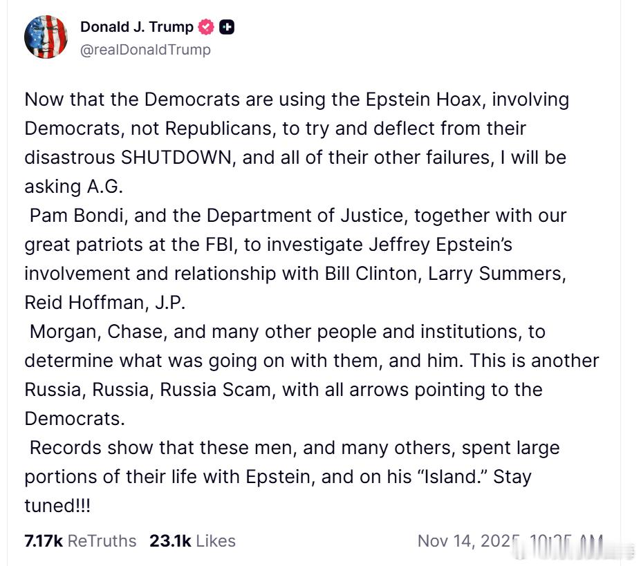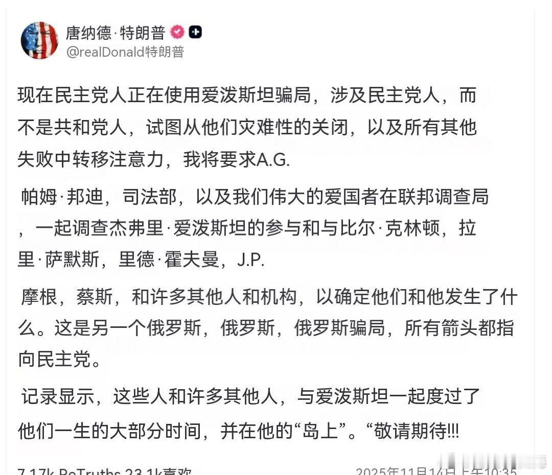 特朗普下令彻查爱泼斯坦与民主党高层的“小岛”勾连。