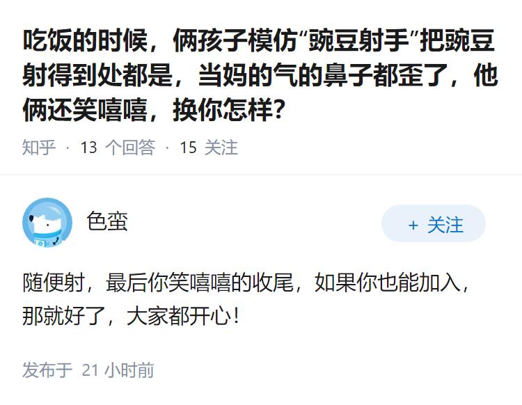 吃饭的时候,俩孩子模仿“豌豆射手”把豌豆射得到处都是,当妈的气的鼻子都歪了,他俩还笑嘻嘻,换你怎样?