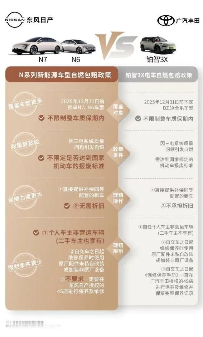 东风日产推出国内首个自燃赔新车政策,被央视主动报道,日产N7和N6产品还是值得肯定的,东风自己的封装技术还是过硬的!行业破局者。没有小字,没有括号。