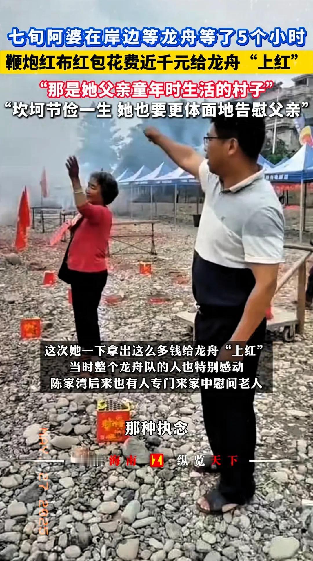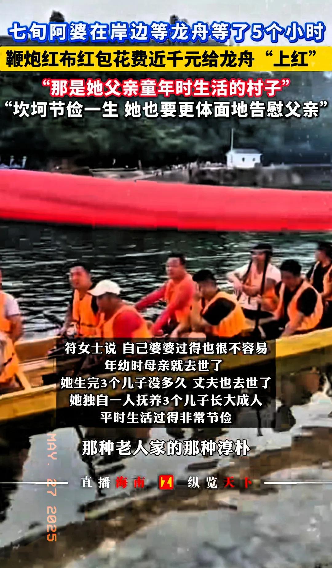 “太感动了!”5月25日湖南麻阳,一七旬阿婆得知娘家的龙舟会经过家附近,竟拿出1000多元准备红包和礼物迎接,一大早就在岸边等龙舟,足足等了5小时,终于等来了陈家湾的龙舟队![害羞] 这一等就是五个小时,阳光渐渐强烈汗水浸湿了她的衣衫,她却始终望着下游方向。 直到龙舟出现,她急忙起身小心地将红布系在龙舟上,又把装着八百元的红包郑重地交给队员,完成这些后她才露出安心的笑容。 这份心意背后藏着一段家族往事,阿婆的父亲自幼失去双亲,由姑婆抚养长大,后来到别的村子做了上门女婿,尽管阿婆自己对陈家湾已经不太熟悉,但那里始终是她心里的一份牵挂。 儿媳说起婆婆这次的大方很是感慨,老人平时非常节俭,连一件新衣服都舍不得买,这次却毫不犹豫地拿出一千多元,这份反差让人更能感受到她对这个仪式的重视。 她年幼丧母在生下三个孩子后丈夫又离世,一个人艰难地把孩子们拉扯大,经历过这么多离别她比谁都懂得亲情的珍贵。 龙舟渐渐远去,红布在风中轻轻飘动,阿婆仍站在岸边目送,就像完成了一个等待多年的心愿菜。 看了湖南麻阳七旬阿婆的故事,真的被戳中泪点了! “节俭一辈子却舍得花1000多块上红,这份心意比钱重多了。” “破防了!阿婆自己过得那么省,为娘家龙舟却一点不含糊。想想现在多少人对老家越来越淡,她还能守着这份根,真的难得。” “说明一点:老人不是没钱,是觉得值不值,在她心里陈家湾的龙舟就是最值的!” “上红不是迷信,是刻进骨子里的传承。” “年轻人可能不懂,但‘上红’就是图个吉祥!龙舟下水披红,寓意顺风顺水,老人家是在用行动守护老传统。” “就像我们村给龙舟点睛,鞭炮一响,全村人的心都齐了——这哪是仪式,分明是凝聚力啊!” “阿婆的父亲从小没了爹妈,被姑婆养大……她等的龙舟,承载的是父亲走过的路,这种感情没经历过的人很难懂。” “想起我奶奶,每年清明一定要回出生地的老宅坐坐,她说‘闻闻土味,心里就踏实’,老一辈的乡土情结,比我们想象中深得多。” “年轻时丧母、中年丧夫,一个人拉扯大三孩子……就这样她还坚持体面地告慰父亲,这种坚韧真的太让人敬佩了。” “她给的不仅是钱,是用一生坎坷换来的温柔:自己吃过苦,所以更想让‘家’的象征风风光光。” “看到阿婆的孙子说‘有些东西比钱重要’,突然泪目——这就是传承啊!龙舟划得快不快不重要,重要的是有人愿意接着划下去。” 如果你的老家有类似龙舟“上红”、祠堂祭祖这类传统,你会主动参与吗?还是觉得这些习俗正在慢慢变成“老一辈的事”? 在评论区聊聊你的看法吧! 信源:蓬勃新闻