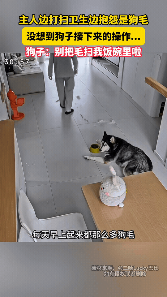 这狗也太聪明了!浙江有个大姐,本来就不太喜欢老公养的狗,每天早上起来扫地,地上全是狗毛,她一边扫一边抱怨:“天天这么多狗毛,脏死了,这狗真没必要养!” 没想到,蹲在旁边的狗居然听懂了。眼看大姐快扫到自己饭碗跟前,它悄悄跑去桌上叼了个糖果盒盖子,把狗盆给盖住了。 估计这狗心里琢磨:确实是我掉的毛多,可我也不是故意的呀!先把饭碗护住,别让她把毛扫进去,或者气不顺把我碗踢了。 这举动把大姐整得又好气又好笑,这狗不光有眼力劲,还挺讲究饮食。虽说招主人嫌弃,但它不顶嘴还会服软,难怪说狗狗能治愈人,确实挺招人疼的。
