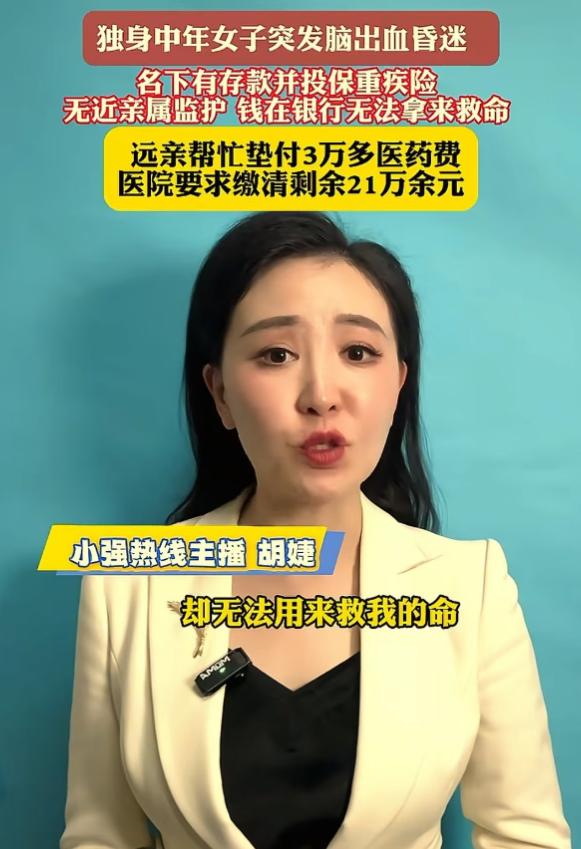 “银行里明明有存款,却不能取出来救自己的命!”上海46岁独身女子突发脑出血昏迷,送医后需紧急手术,但女子未婚无子女,父母双亡,没有近亲属监护,陷入昏迷的她无法动用自己的存款救命!银行拒绝支付医疗费,保险公司拒赔! 上海46岁的蒋女士倒在出租屋时,兜里揣着工资卡,手机里存着重疾险保单,可这些保命钱,偏偏卡在最关键的时刻动不了。 10月14号上午,她给单位打电话请假,声音虚得发飘,说头晕得站不稳,同事下午再联系,电话只响不接。 有人赶紧跑上门,一推开门就看见她瘫在地上,眼神涣散,连句完整话都说不出,120拉到医院,诊断书拍在桌上:脑出血,必须立刻开颅。 医生转头要家属签字,在场人全愣了,蒋女士独身一辈子,没结婚没孩子,父母早就不在了。 派出所查遍户籍,亲属关系栏干干净净,连个兄弟姐妹都没有,这手术没人签字,没法做。 急得团团转时,有人想起个远房亲戚吴先生,蒋女士父亲表姐的孙子,论辈分算表侄,一年到头也就年夜饭见一面。 吴先生接到电话还以为是诈骗,赶到医院看见插着氧气管的蒋女士,没多犹豫,在手术同意书上签了字,又和蒋女士单位凑了3万块垫上。 手术熬到半夜算成功,可没等松口气,蒋女士又犯了“烟雾病”,脑血管跟乱麻似的,随时可能再出血。 人直接送进ICU,呼吸机、血氧监测仪全天开着,24小时护工守着,账单像流水一样涨,到11月11号,医药费飙过21万,每天还得添五千到一万。 医院财务天天找吴先生催款,他快扛不住了,“我不是家属,动她一分钱都违法,”这话没错,法律上他连近亲属都不算,没资格碰蒋女士的存款和保险。 居委会急得跳脚,邮电居民区的王书记带着人跑银行、找保险公司,想以社区名义当临时代理人,把钱直接划去医院。 银行说没授权不能动,保险公司更直接:没有法定监护人签字,理赔程序压根启动不了,好好的重疾险,成了张废纸。 有人提议找其他亲戚,公安查到兰州有蒋女士姑妈的孩子,打过去对方只说“再想想”,没了下文,就算对方愿意来,表亲也不算法定近亲属,照样没监护权。 最后没办法,居委会只能硬着头皮走法院程序,先申请宣告蒋女士为限制民事行为能力人,再求法院指定自己当监护人。 王书记说这是头一回办这事,要医院出评估报告,要公安开亲属证明,材料堆得老高,流程至少得一两个月,可ICU里的蒋女士等不起。 吴先生垫的3万块早花完了,医院只能继续垫付维持治疗,病床边的监护仪滴答响,屏幕上的数字跳得平稳,可外面的人都清楚,这平稳全靠钱撑着,蒋女士的工资卡还在兜里,银行账户里的存款躺着不动,却救不了它的主人。 好在蒋女士后来脱离了危险,呼吸机撤了,意识也慢慢清醒,居委会还在跑法院的流程,吴先生没再垫钱,就偶尔去医院问问情况。 病房窗外的树叶落了又长,只是没人敢想,要是她醒不过来,那些存款和保险,最后会变成什么。