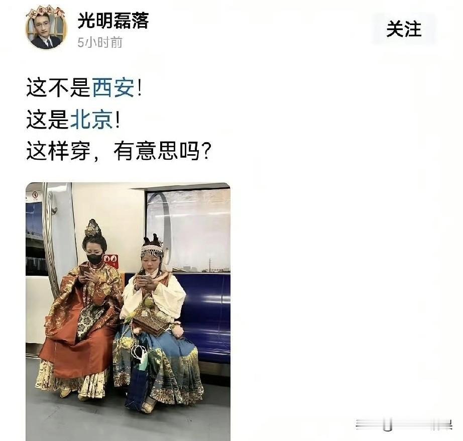 两位女子穿汉服在地铁里乘车,这位博主似乎意见很大,我只想问问为什么不能在北京穿汉服呢? 在这位博主心里,估计非常的怀念猪尾巴辫子的大清,可能他也是当年流亡的满清王爷们的后代之一吧。 不然,他怎么会反感呢。