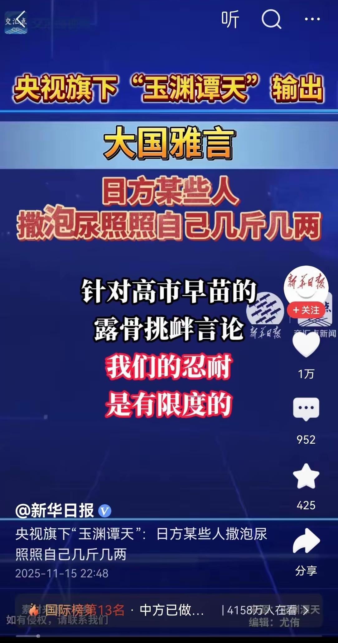 央妈都开始爆粗口了,看来已经是忍到极限了。 头一次见玉渊谭天骂街!我以为玉渊谭天是个人名?没想是官媒!暴躁又兴奋的官媒。 就该这样,委婉文雅的词汇他们听不懂! 玉渊谭天这波“暴躁输出”直接戳中DNA!“撒泡尿照照自己”“砍下肮脏的头”,官媒放下文雅直戳要害,看得人热血沸腾!对不知收敛的挑衅者,客气就是纵容,欠揍就得狠狠教训!这波硬气表态,就是中国底线不容触碰的最强宣言,看得太过瘾!