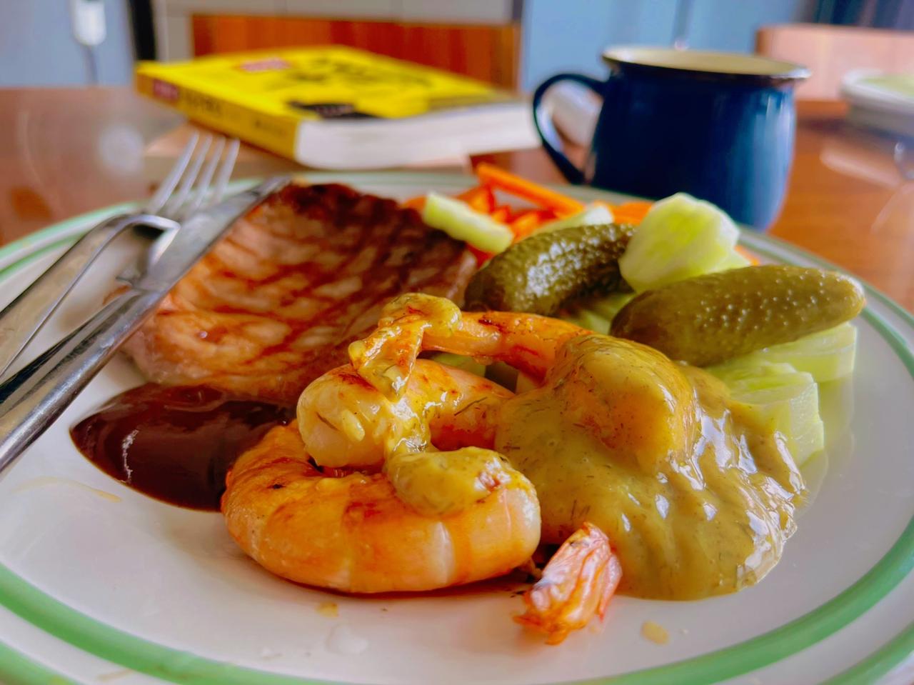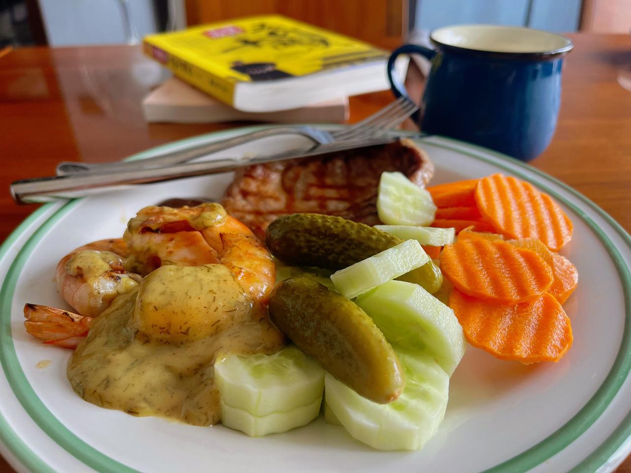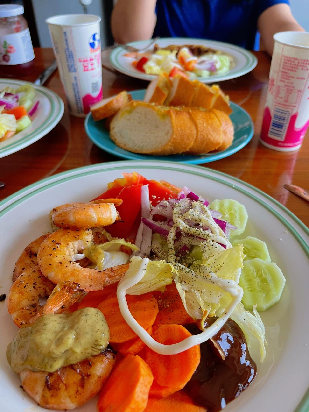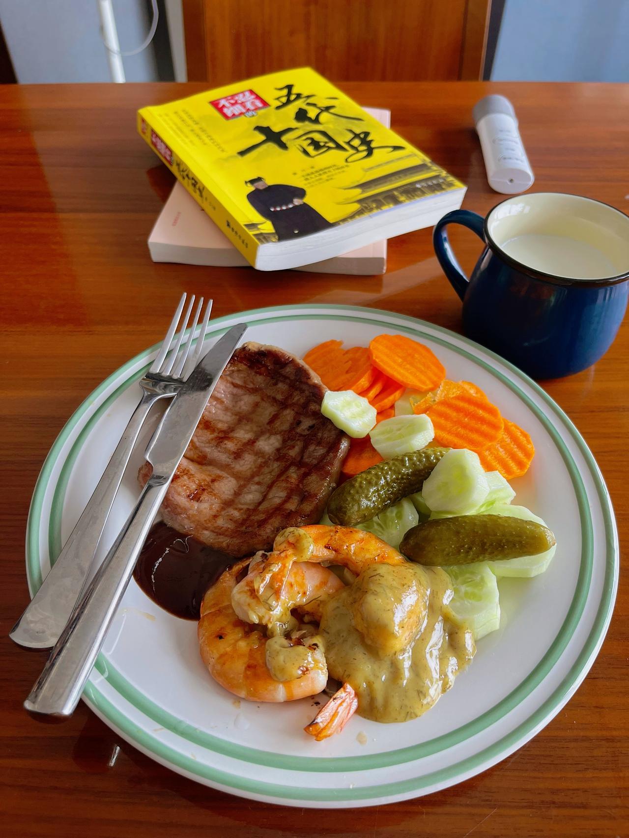 其实西式早餐一点也不麻烦,动火的只是煎个牛排和虾,其余的切吧切吧就行了,淋上点酱汁,倒杯牛奶就齐活了。[耶]