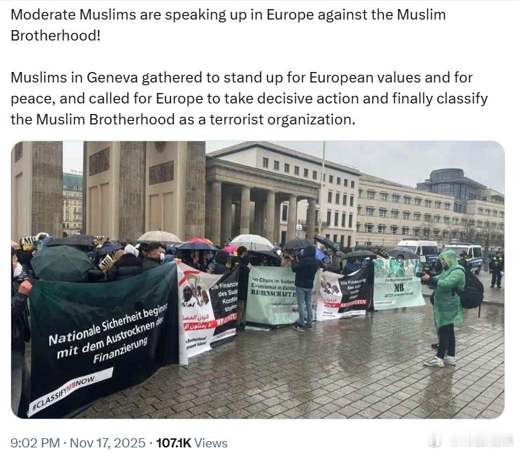 欧洲的温和派穆斯林正在站出来反对穆斯林兄弟会!日内瓦的穆斯林聚集在一起,表达对欧洲价值观和和平的支持,并呼吁欧洲采取坚决行动,将穆斯林兄弟会列为恐布组织。