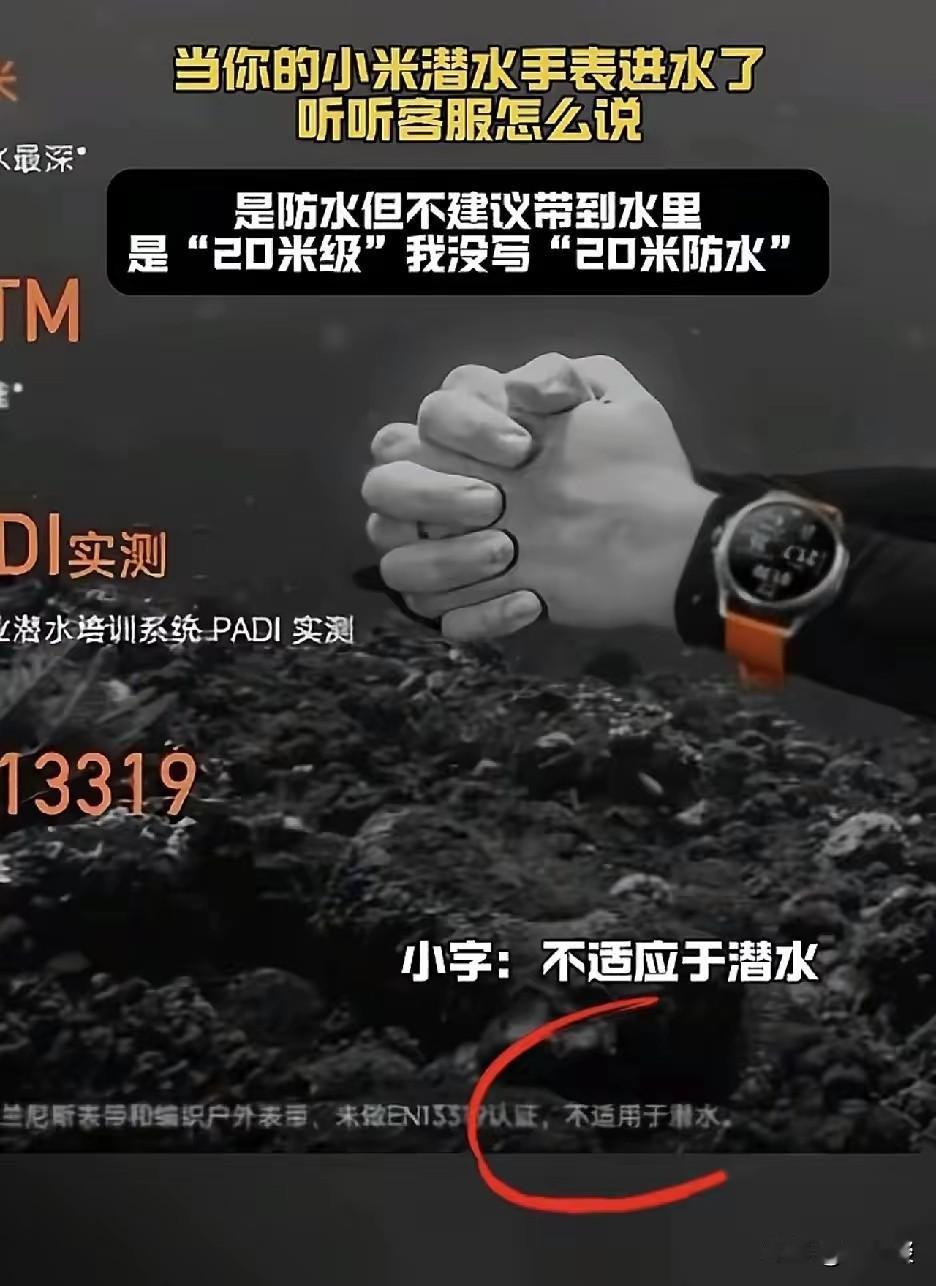 买东西的时候一定要看说明书中的小字,因为小字才是关键。某米牌潜水手表写明,支持潜