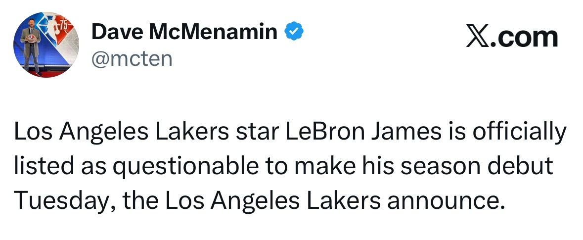 Shams表示詹姆斯出战成疑,这意味着他有望迎来新赛季首秀。