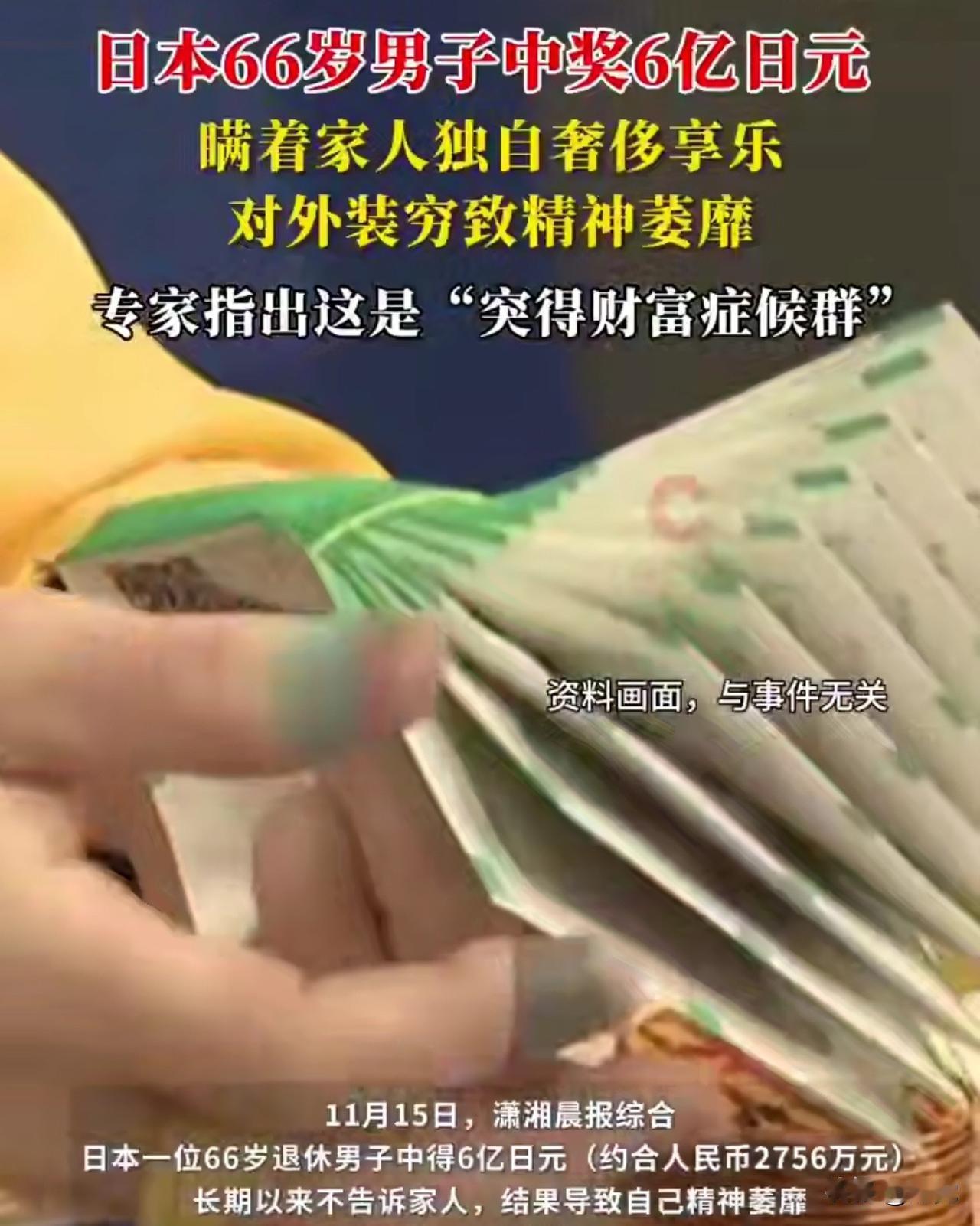 日本一男子中6亿日元 对外装穷致精神萎靡 人永远赚不到认知以外的钱 这句话的含金量还在提高 果然意外之财 也是一种负担 我也想有这种负担[抠鼻] 近日,媒体报道 日本一个退休男子中得6亿日元 (约合人民币2756万元)大奖 长期以来不告诉家人 长期背负着孤独罪恶感以及过往阴影 结果导致自己精神萎靡 最终找了理财专家 专业的事还得让专业的人来做