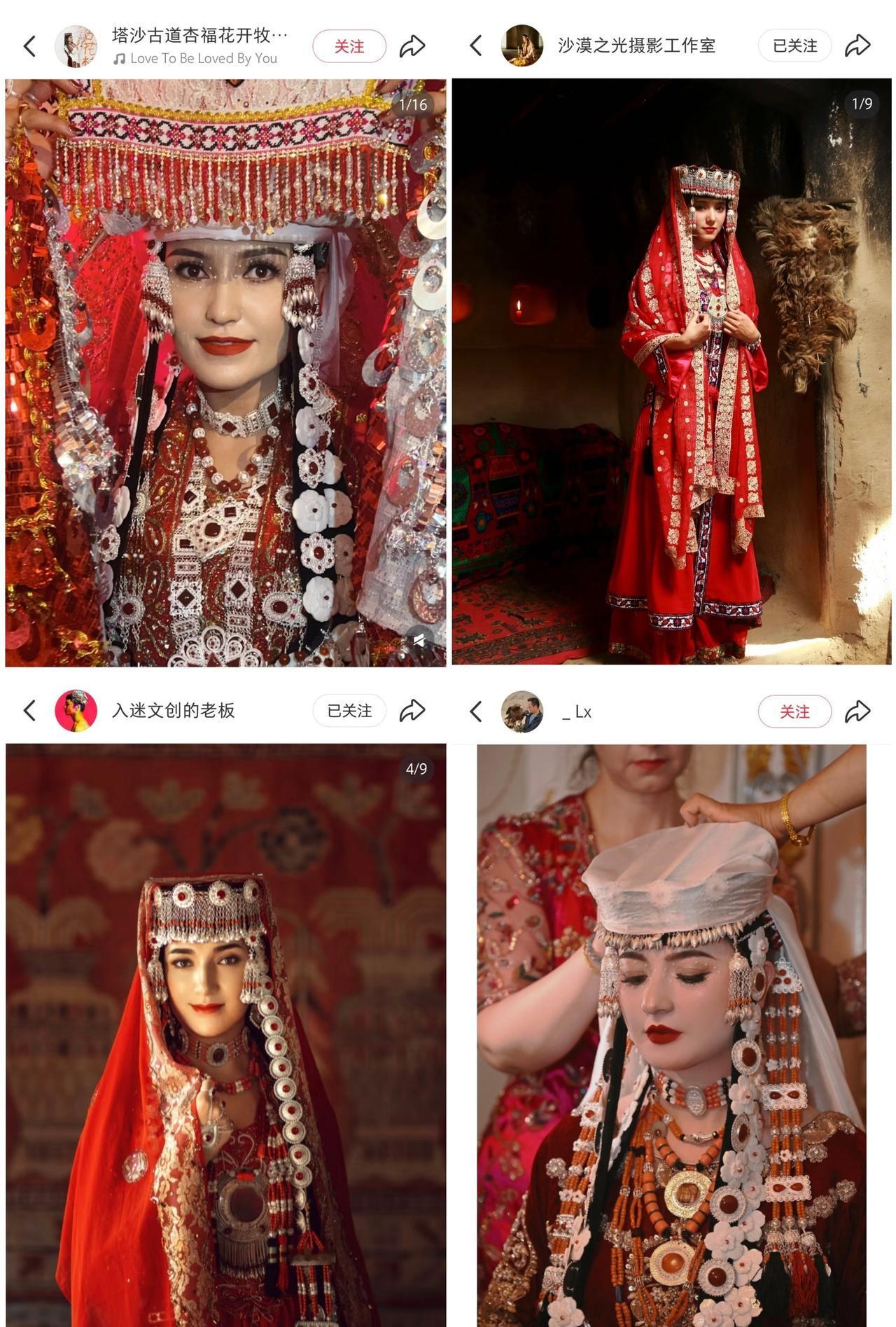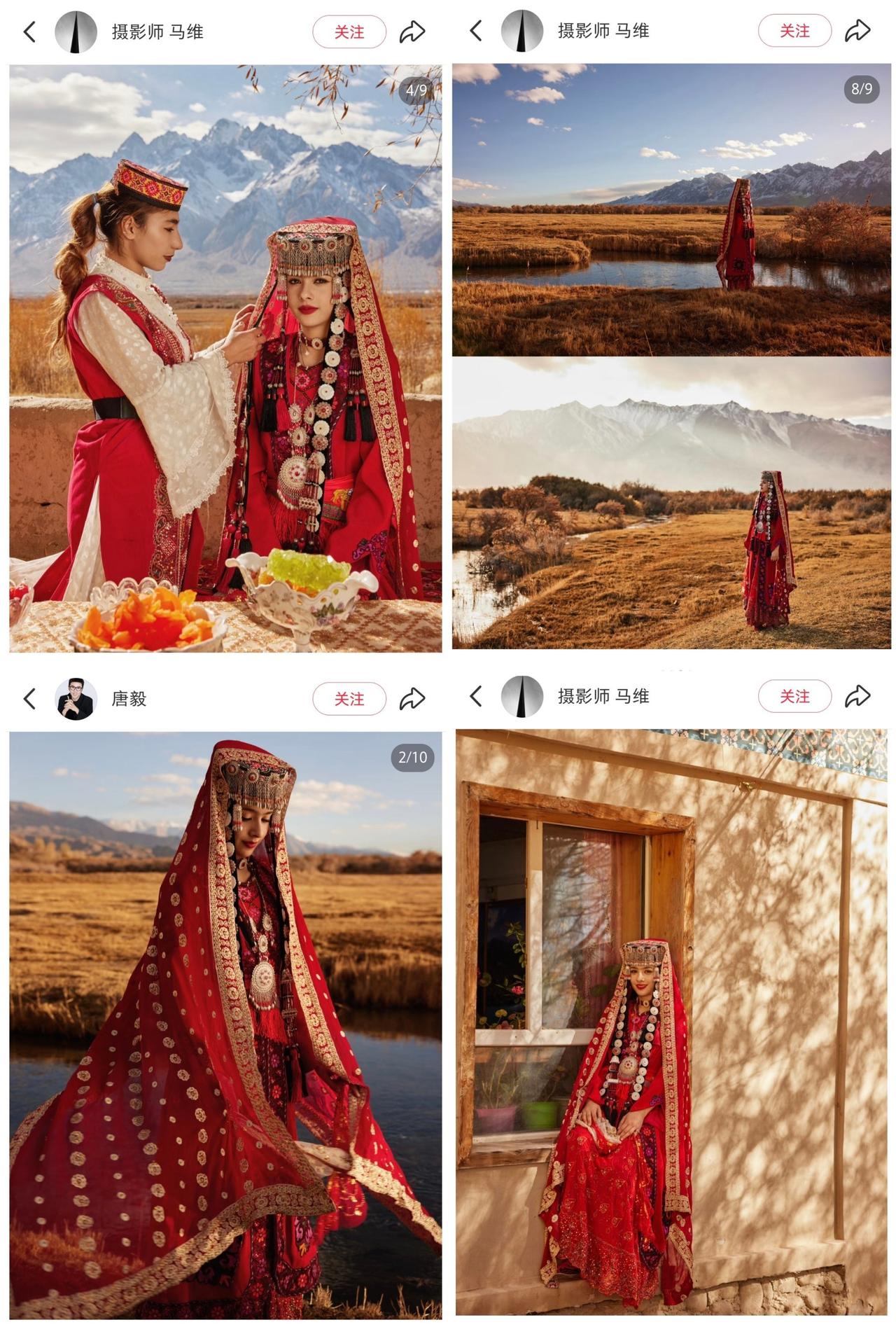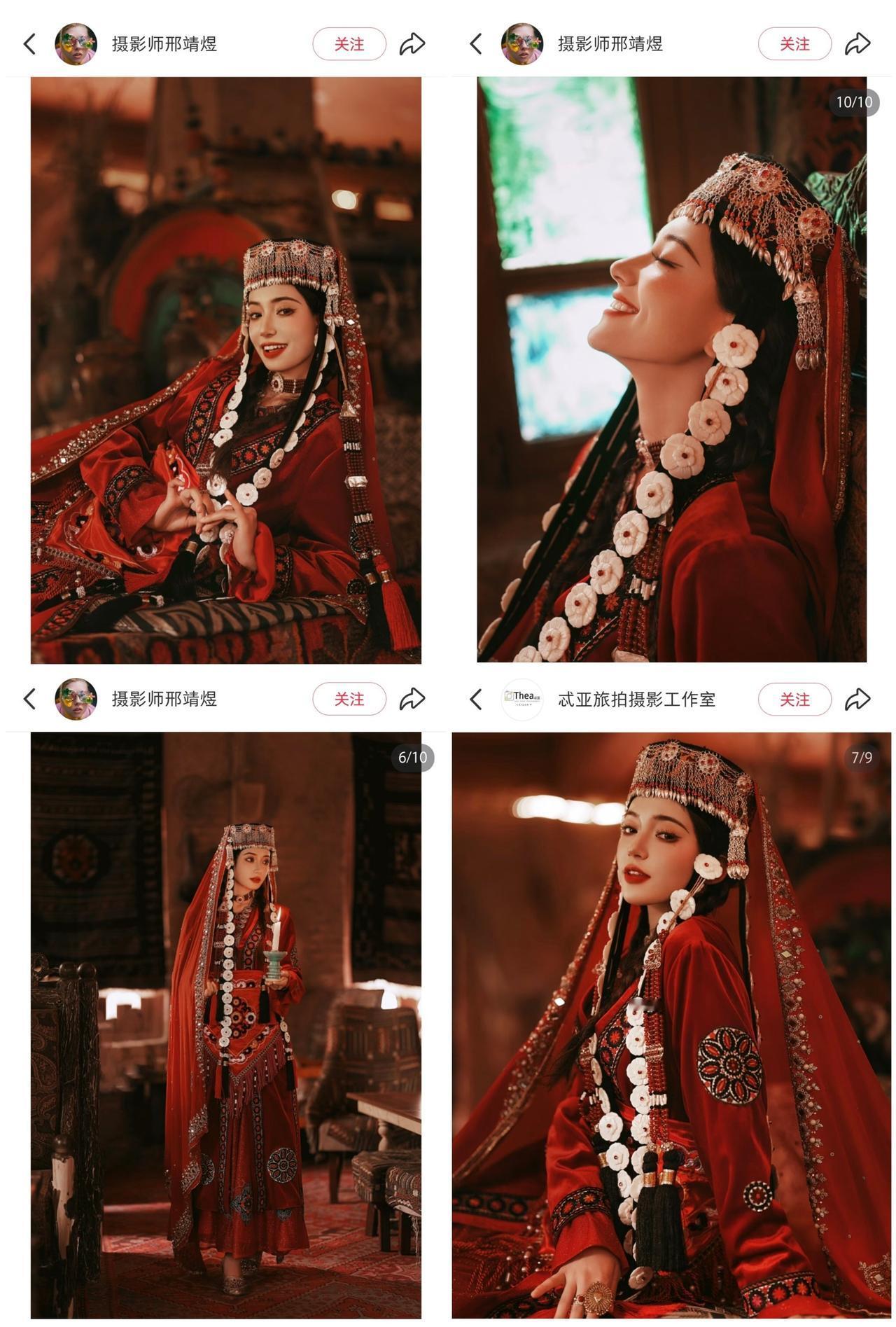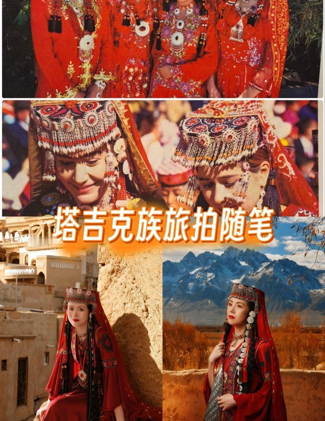 (起因是在喀什拍了个塔吉克族服饰旅拍,有些满意与不满意的点,回来找了些资料写个分析玩玩,图片出自网上,都标注了出处,如有冒犯,请告知侵删) 🌈民族介绍: 1,服装:我国高原塔吉克族,旅拍服饰一般有两种类型,很隆重的红色新娘服饰/轻便日常服装头帽。(也有部分旅拍提供乌兹别克斯坦或阿富汗收藏来的平原塔吉克族服饰,本文未归纳进)图2/3/4 塔族婚服全套里外多层,另加头饰和项链戒指手帕。因为不希望出现民族服饰混搭乱搭的笑话,所以特地选了价格偏贵的旅拍,满意的是该组服装,之后去塔县博物馆看过塔吉克民族介绍,确实正宗全套无误 2,环境风格:我国塔族居住在塔什库尔干县高原上,建筑多用石块或土坯砌筑,夏季牧场用临时土屋或毡房。近年来 屋内装饰,尤其是婚房软装比较多采用金/红/白/黄色靠垫缎被挂毯装饰。居所所在自然风光有草原/雪山/河流,冬季覆盖白雪。图5/6/3下图 💔所以,当得知旅拍场所选择在巴依老爷房子里时,本人非常不愉快。巴依老爷家是蓝绿调的维族色彩,且建筑风格精致豪华,既不符合塔族朴实自然的气质,塔族服饰在维族家旅拍,也是个违和的民族概念 理解旅拍摄影规划,喀什是维族地区,并没有塔族环境氛围,而巴依老爷家色彩丰富,建筑异族风格明显,常年旅拍经历能总结出什么姿势在什么位置有最好的光影,有限的时间内达到出片效率最高,让双方满意的旅拍作品 ⚡因此,我一开始就错了,应该去塔族聚居地的塔县拍,而不是喀什。但是塔县的自然风光有季节限制,且旅拍机构选择少。鱼和熊掌,难以兼得 ---------------------------------&-------- 🦄拍摄过程: 喀旅的拍摄,设置了摄影工作室人物摄影和外景拍摄两个环节: 1,室内拍摄;参照靳尚谊油画《塔吉克新娘》图7, 婚服富丽繁复,与原画里静谧质朴感不同,但摄影室打的灯光至少也能出来光影效果。只是本人不太理解摄影师的独特爱好,他非要把婚纱拉直,我喜欢和油画一样略微皱褶有曲线弯度,使动作更自然一点。总体来说这种摄影风格,在其他搜索中没有同类拍的更好的,满意 2,外景拍摄;平心而论,除了民族不相符,巴依老爷家是出片的好地方。各种角度位置千锤百炼后,都能迅速达到旅拍美照效果。摄影师非常专业,不愿意拍不符合他审美的位置。比如图8,摄影师认为光线不够效果会糊,他的担忧是正确的,但我觉得满墙陶罐很有趣,平不平面无所谓。 -------------------&------------------------ ❓️🈸📸但此次拍摄最耿耿于怀的,还是什么样的环境背景符合塔吉克族的真实民族调性? 解决方法有二 1,如果在喀什古城内拍摄 [糖果]不考虑民族概念违和的前提下,图9是以人为本的优秀范本。画面70%都由人物占据,背景也选择了贴合塔吉克生活环境的米色土墙/红色挂图/米色陶罐的统一色调,更突出了立体妆容人物本身的英气勃发,符合塔吉克族带来的异域感。没有过多的强调光影,也没有被维族丰富色调干扰画面 结论,在巴依老爷家选择色调单一的背景,可以避免民族风格冲突,如图10(另外需注意塔吉克族常用哪些乐器) ❤🩹另一个相同服饰相似环境范例,图11,应该也会受欢迎,但美则美矣,这种妖娆美更像披着塔吉克族服饰的狐狸,而不是高原上的鹰 🌔选择浅色塔吉克常服,可以降低红色婚服带来的民族仪式感,和巴依老爷家不再违和,也更适合汉人的弱质气质,如图12 🌳选择婚服但换景,高台民居的夯土墙,与塔县居所相同的材质,作为背景更融洽,如图13 2,如果去高原 🔥以高原雪山自然风光为外景,就搜到的照片,很难同时把人与景同时结合。图14,犹如旅行杂志的插图,氛围感很好,在托格伦夏村;图15,杏花季与雪季,对摄影师外拍的要求更高 而作为人物写真,图16,无疑是所有搜到的摄影中最喜欢的南波万。符合风景美/服饰美/人物美,各种审美[爱慕] 最后,自己手机P了一张✌