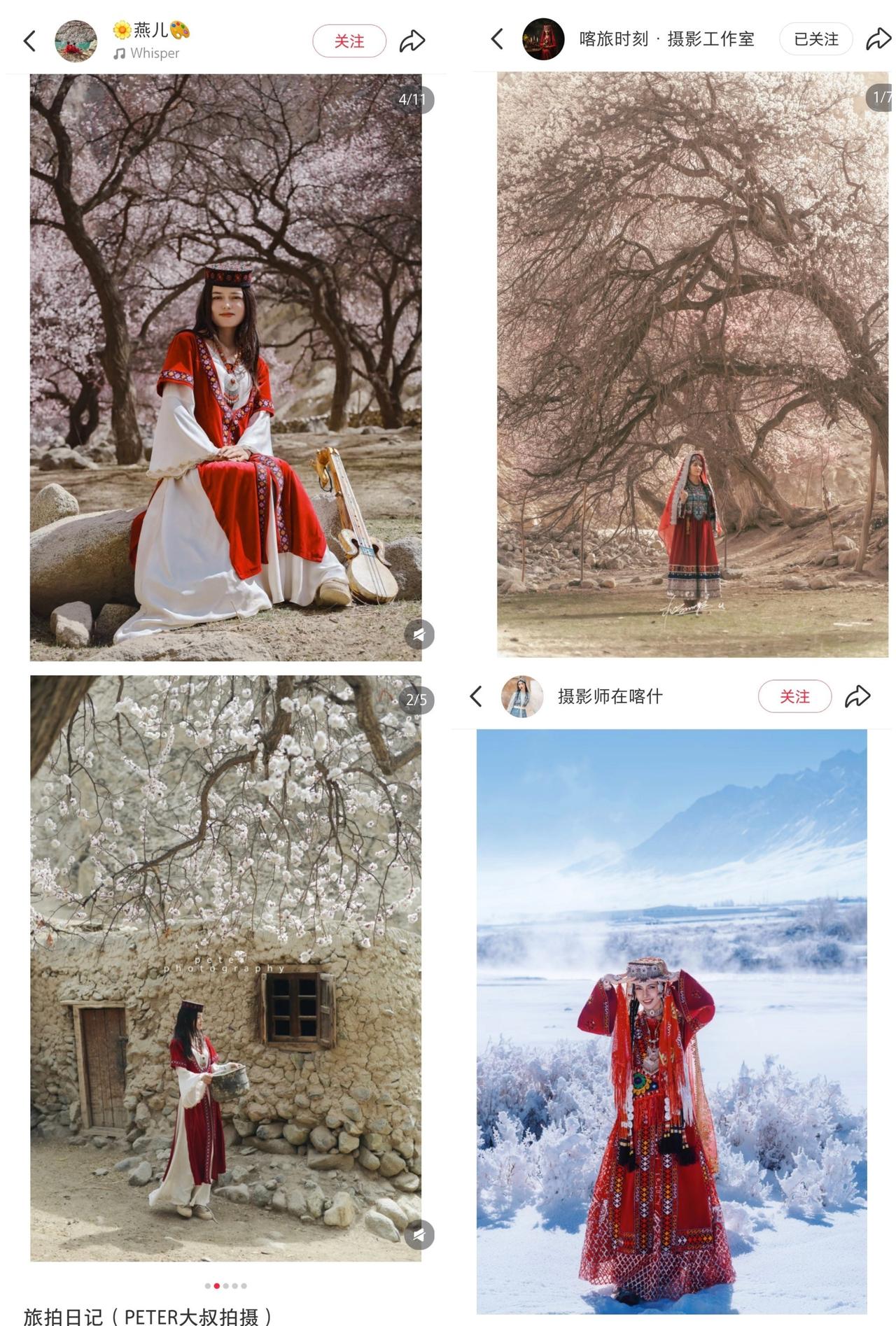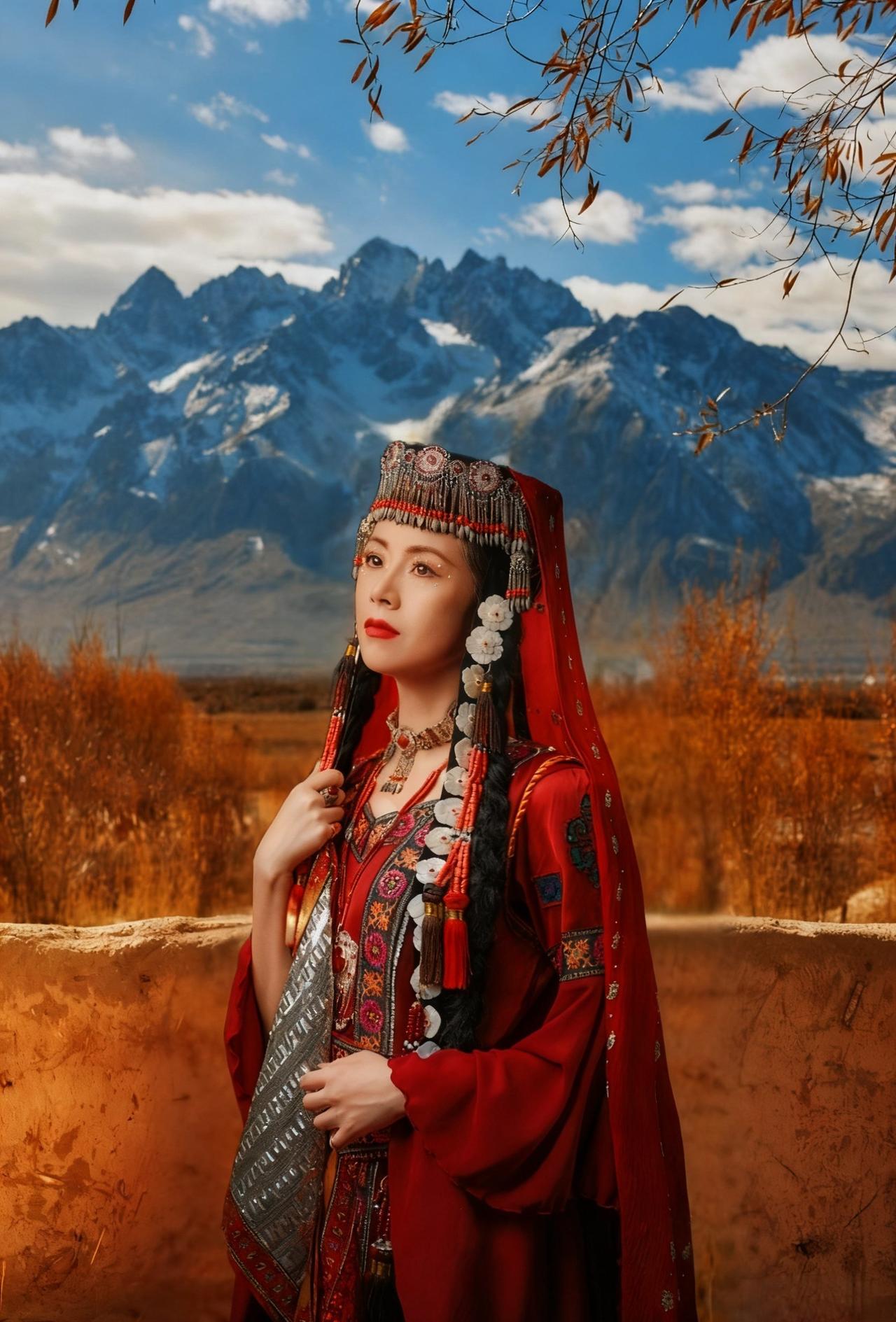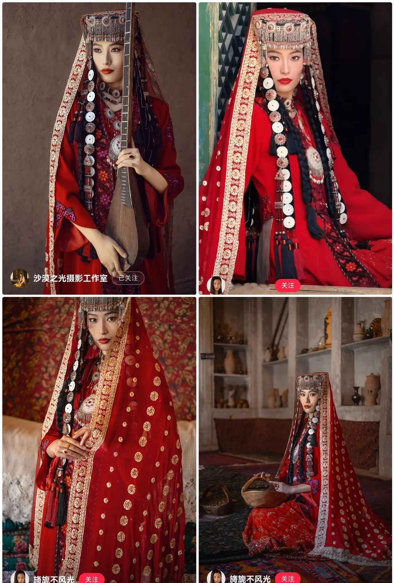 (起因是在喀什拍了个塔吉克族服饰旅拍,有些满意与不满意的点,回来找了些资料写个分析玩玩,图片出自网上,都标注了出处,如有冒犯,请告知侵删) 🌈民族介绍: 1,服装:我国高原塔吉克族,旅拍服饰一般有两种类型,很隆重的红色新娘服饰/轻便日常服装头帽。(也有部分旅拍提供乌兹别克斯坦或阿富汗收藏来的平原塔吉克族服饰,本文未归纳进)图2/3/4 塔族婚服全套里外多层,另加头饰和项链戒指手帕。因为不希望出现民族服饰混搭乱搭的笑话,所以特地选了价格偏贵的旅拍,满意的是该组服装,之后去塔县博物馆看过塔吉克民族介绍,确实正宗全套无误 2,环境风格:我国塔族居住在塔什库尔干县高原上,建筑多用石块或土坯砌筑,夏季牧场用临时土屋或毡房。近年来 屋内装饰,尤其是婚房软装比较多采用金/红/白/黄色靠垫缎被挂毯装饰。居所所在自然风光有草原/雪山/河流,冬季覆盖白雪。图5/6/3下图 💔所以,当得知旅拍场所选择在巴依老爷房子里时,本人非常不愉快。巴依老爷家是蓝绿调的维族色彩,且建筑风格精致豪华,既不符合塔族朴实自然的气质,塔族服饰在维族家旅拍,也是个违和的民族概念 理解旅拍摄影规划,喀什是维族地区,并没有塔族环境氛围,而巴依老爷家色彩丰富,建筑异族风格明显,常年旅拍经历能总结出什么姿势在什么位置有最好的光影,有限的时间内达到出片效率最高,让双方满意的旅拍作品 ⚡因此,我一开始就错了,应该去塔族聚居地的塔县拍,而不是喀什。但是塔县的自然风光有季节限制,且旅拍机构选择少。鱼和熊掌,难以兼得 ---------------------------------&-------- 🦄拍摄过程: 喀旅的拍摄,设置了摄影工作室人物摄影和外景拍摄两个环节: 1,室内拍摄;参照靳尚谊油画《塔吉克新娘》图7, 婚服富丽繁复,与原画里静谧质朴感不同,但摄影室打的灯光至少也能出来光影效果。只是本人不太理解摄影师的独特爱好,他非要把婚纱拉直,我喜欢和油画一样略微皱褶有曲线弯度,使动作更自然一点。总体来说这种摄影风格,在其他搜索中没有同类拍的更好的,满意 2,外景拍摄;平心而论,除了民族不相符,巴依老爷家是出片的好地方。各种角度位置千锤百炼后,都能迅速达到旅拍美照效果。摄影师非常专业,不愿意拍不符合他审美的位置。比如图8,摄影师认为光线不够效果会糊,他的担忧是正确的,但我觉得满墙陶罐很有趣,平不平面无所谓。 -------------------&------------------------ ❓️🈸📸但此次拍摄最耿耿于怀的,还是什么样的环境背景符合塔吉克族的真实民族调性? 解决方法有二 1,如果在喀什古城内拍摄 [糖果]不考虑民族概念违和的前提下,图9是以人为本的优秀范本。画面70%都由人物占据,背景也选择了贴合塔吉克生活环境的米色土墙/红色挂图/米色陶罐的统一色调,更突出了立体妆容人物本身的英气勃发,符合塔吉克族带来的异域感。没有过多的强调光影,也没有被维族丰富色调干扰画面 结论,在巴依老爷家选择色调单一的背景,可以避免民族风格冲突,如图10(另外需注意塔吉克族常用哪些乐器) ❤🩹另一个相同服饰相似环境范例,图11,应该也会受欢迎,但美则美矣,这种妖娆美更像披着塔吉克族服饰的狐狸,而不是高原上的鹰 🌔选择浅色塔吉克常服,可以降低红色婚服带来的民族仪式感,和巴依老爷家不再违和,也更适合汉人的弱质气质,如图12 🌳选择婚服但换景,高台民居的夯土墙,与塔县居所相同的材质,作为背景更融洽,如图13 2,如果去高原 🔥以高原雪山自然风光为外景,就搜到的照片,很难同时把人与景同时结合。图14,犹如旅行杂志的插图,氛围感很好,在托格伦夏村;图15,杏花季与雪季,对摄影师外拍的要求更高 而作为人物写真,图16,无疑是所有搜到的摄影中最喜欢的南波万。符合风景美/服饰美/人物美,各种审美[爱慕] 最后,自己手机P了一张✌
