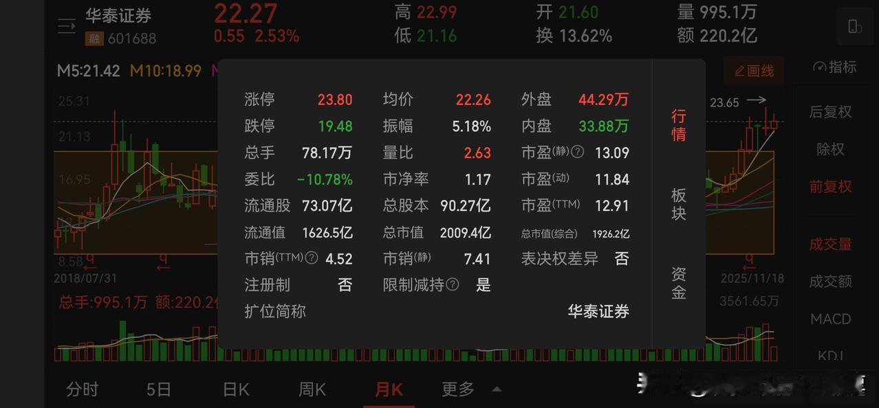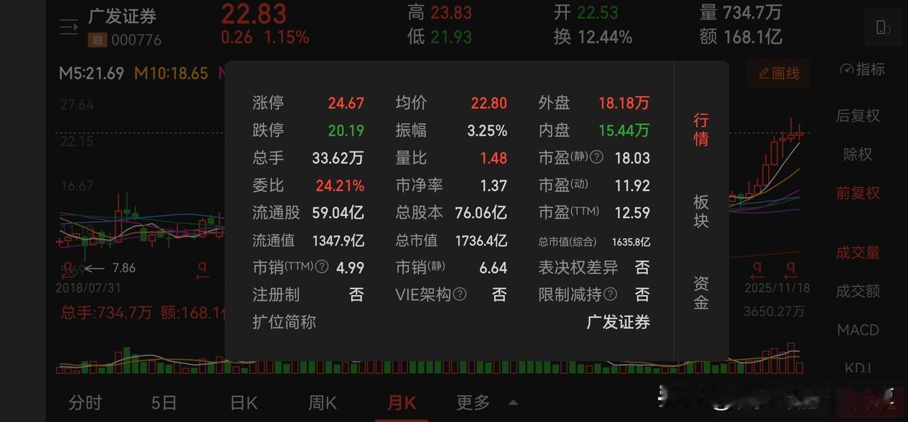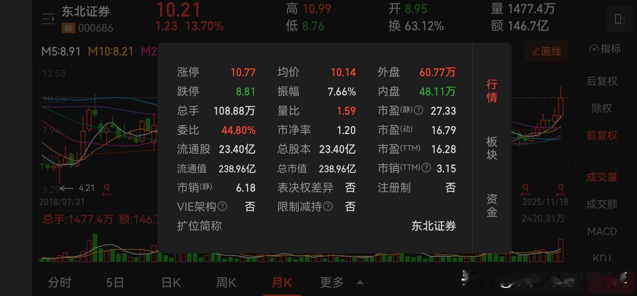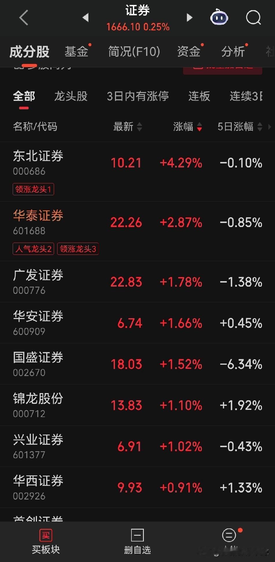 券商只要不放量,大概率就是在盘底。我们现在看券商虽然没有大涨,但是盘面上红绿参半,说明暗流涌动,待时而动。 从早盘领涨的几个品种来看,我们选前四个,东北证券和华泰证券的市净率,都还不到1.2,广发证券和华安证券的市净率,一个1.37,一个1.35,这都是非常低的市净率,说明聪明的资金在寻找低估值、高确定性的券商品种在布局。 国盛金控现在改名为国盛证券,它的市净率是三点几,有点高。 大家关注盘面上的这些特征,看看自己的持仓和布局,基本上会有一个参照。