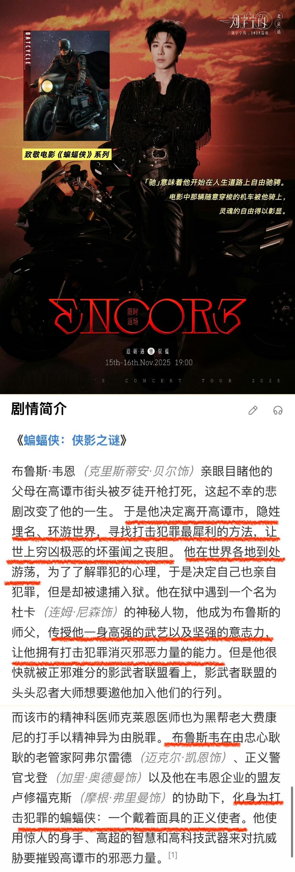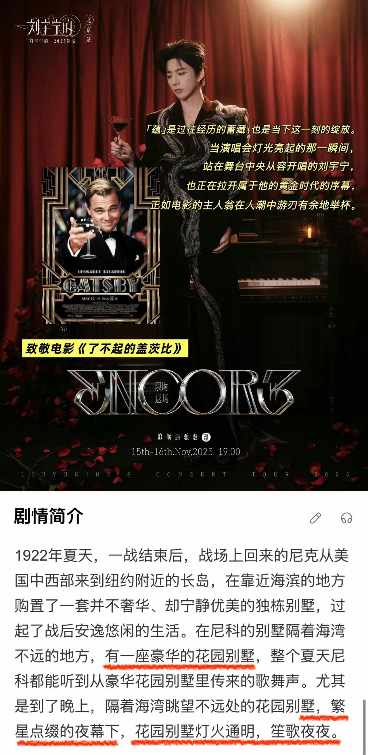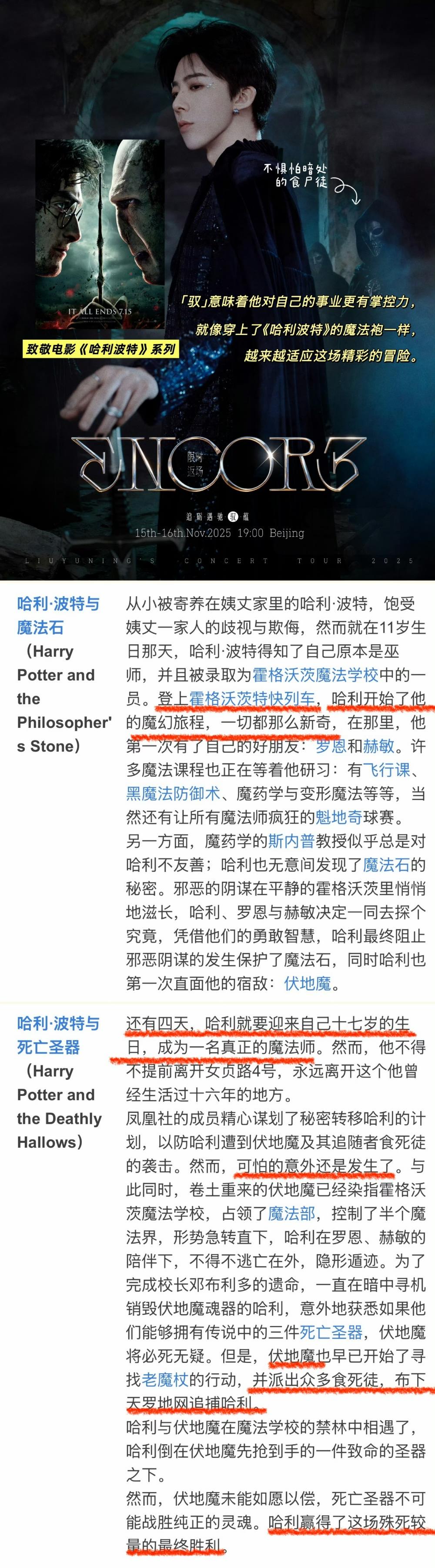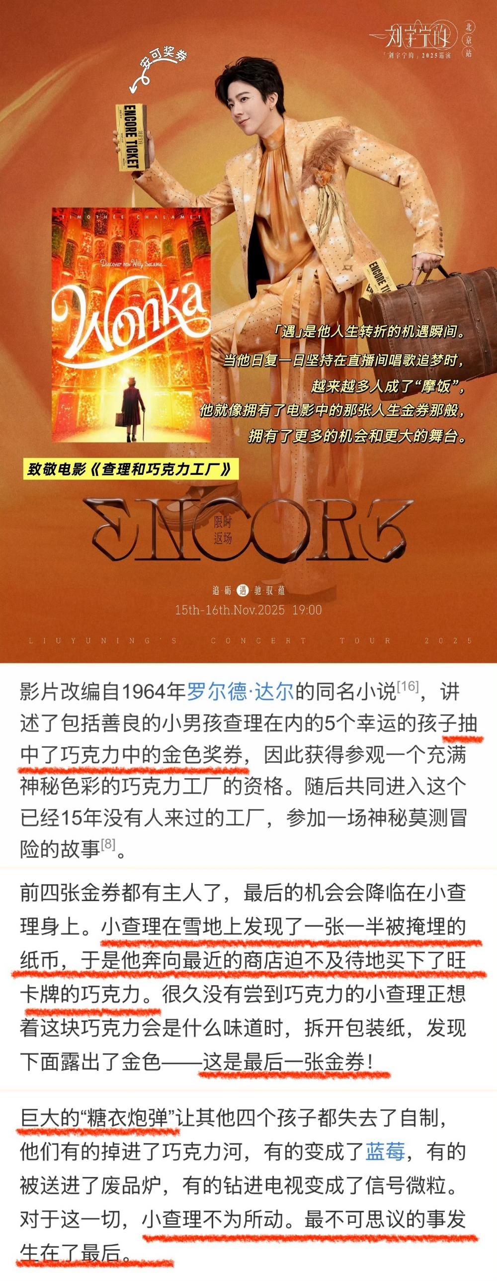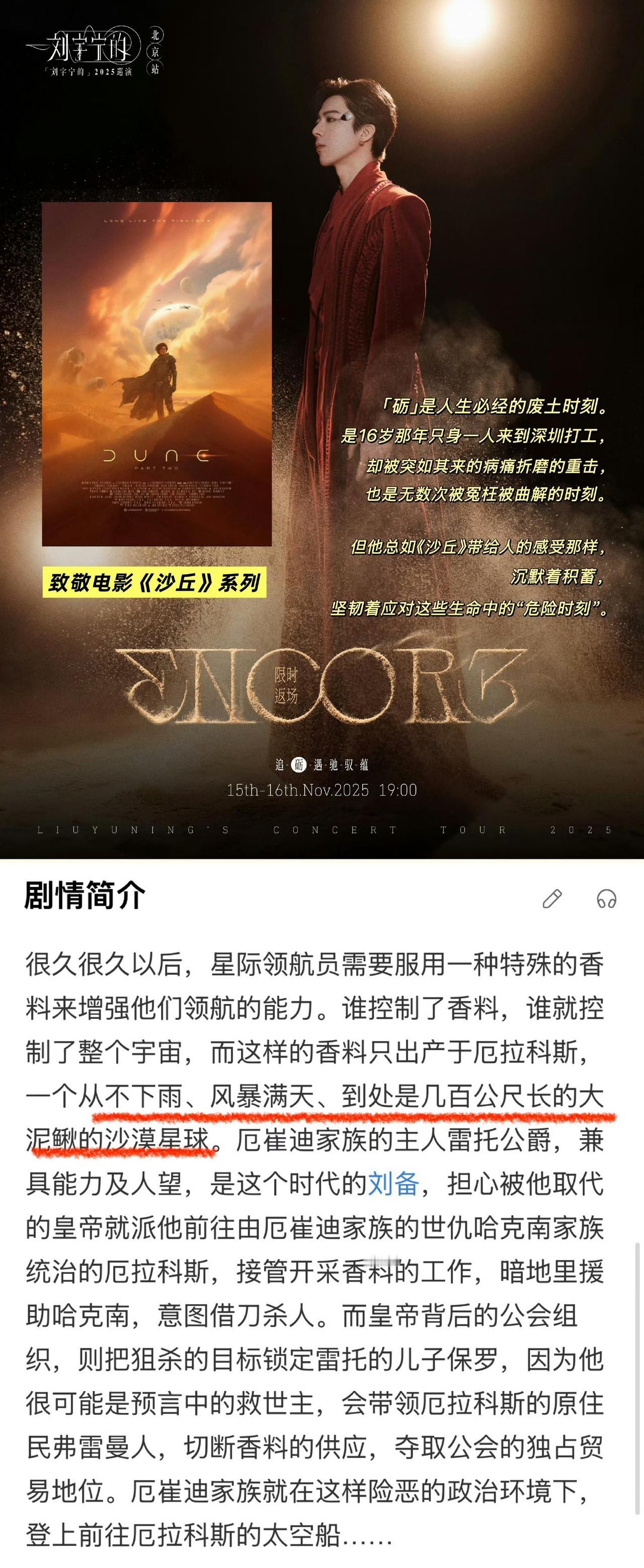 刘宇宁演唱会演六角!这波callback太会玩 谁懂啊!刘宇宁北京演唱会直接玩出花,一口气cos六个角色,连人生都被他做成“影视回顾展”了! 从酒吧唱歌追梦者到如今的大明星,他把六年分成六段:16岁深圳打工遇磨砺,像《沙丘》男主硬扛;直播间吸粉获机遇,堪比拿到《查理和巧克力工厂》金券;后来事业驰骋,骑上《蝙蝠侠》机车耍帅;如今掌控人生,穿“哈利波特魔法袍”当大明星,最后用《盖茨比》姿态绽放。 每段都贴电影梗,连出发图都带关键字,结尾还callback六年前首唱会。宁哥这波操作,不愧是影音双栖“卷王”,把人生过成电影,也太会了吧!