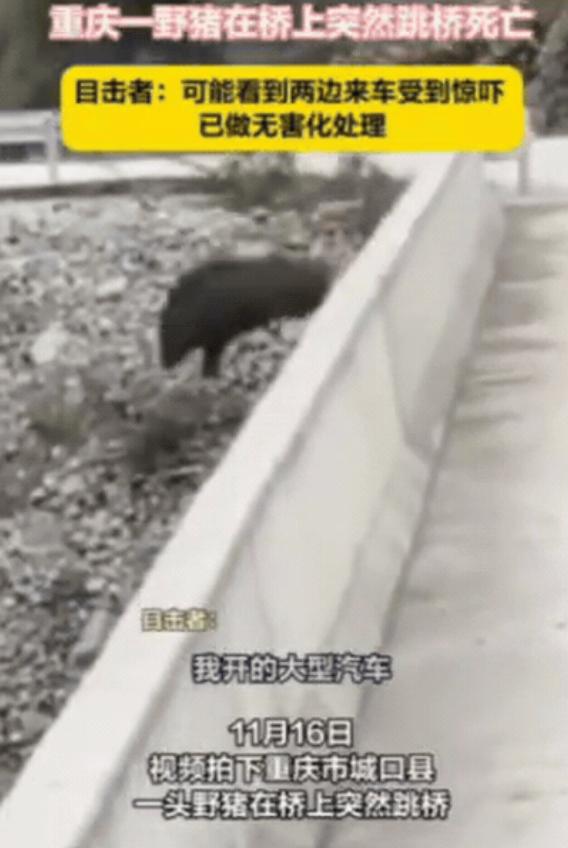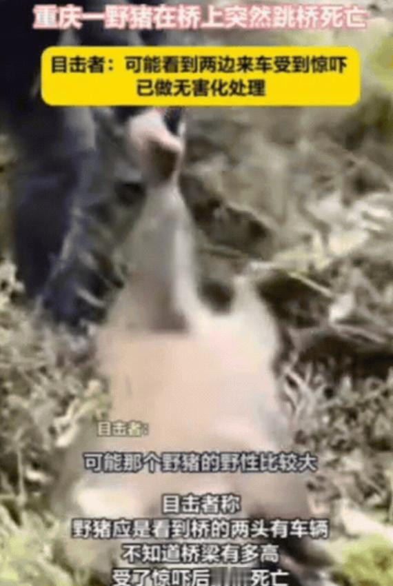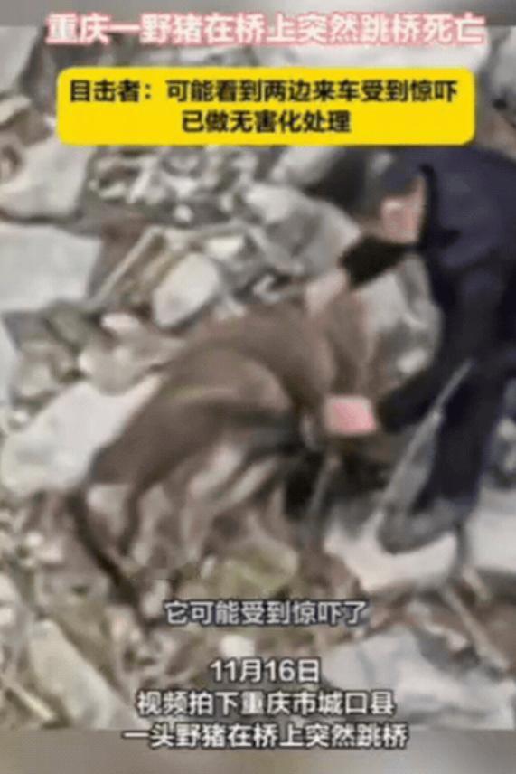 重庆一男子开车过桥,突然发现前方出现一头野猪,他刚准备避让,没想到,野猪竟然先一步冲向桥边,直接蹦过护栏,跳下桥摔死了!男子傻眼了,旁边的路人也愣住了,这是什么操作?无奈只能报警处理,不知道那个下面有多高啊,他就从桥的护栏一下给飞出去。 重庆城口县高燕镇河岸村的午后,新建大桥上车流稀疏,货车司机胡先生刚把车停在桥头,眼角余光瞥见路边庄稼地窜出个黑影,七八十斤的野猪,鬃毛倒竖,直奔桥面而来。 野猪奔到桥中央突然顿住,对向车道的摩托车恰好驶近,轰鸣声惊得它猛地回头,前后都是铁壳子,桥面不过三四米宽,两边护栏挡着去路。 它在水泥地上来回打转,蹄子敲得地面哒哒响,鼻子里喷着粗气,黑亮的眼睛里全是慌乱。 胡先生攥着方向盘没敢动,摩托车司机也刹了车,两人眼睁睁看着野猪在桥上来回跑了两圈,突然猛地弓起身子,四条腿发力冲向护栏,那一下跳得又高又急,黑乎乎的身子擦过护栏顶端,直直坠向桥下。 “砰”的一声闷响从二十多米下传来,胡先生跑到桥边往下看,河道乱石堆上,野猪已经没了动静,旁边路过的村民也凑过来,都张着嘴说不出话——谁也没见过这么烈性的逃生。 没等多久,胡先生喊来几个村民,大家找了根粗木杠,小心把野猪从石滩抬上来,这是头成年野猪,身上没外伤,显然是高坠摔碎了内脏,天热容易发臭,几人在附近挖了深坑,把它埋了进去,免得滋生细菌。 视频传到网上,有人打趣野猪“想不开”,更多人跟着揪心,野生动物专家后来解释,这根本不是寻短见。 野猪视力差,天生怕惊,当时桥面的引擎声、陌生环境,再加上前后堵死的绝境,把它逼进了死胡同,它哪能判断二十多米的高度?只当护栏外是生路,慌不择路就跳了。 这事儿在重庆不算新鲜,前阵子两江新区公园见过野猪踪迹,铁山坪景区也发现过野猪群,还有小区闯进野猪撞坏汽车的。 一方面生态好了,全国野猪都快两百万头了;另一方面城市往外扩,山林被切成一块一块,它们只能往人堆里钻,这座新建的桥,刚好卡在野猪下山觅食的路上,出事早晚的事。 桥面很快恢复通行,车轮碾过野猪曾经徘徊的地方,桥下石滩被太阳晒得发白,好像什么都没发生过,但胡先生总想起那道坠落的黑影,要是桥边能有个临时通道,要是摩托车晚来几秒,会不会是另个结果? 其实九龙坡区有小区做得好,居民跟松鼠和平相处,还主动喂吃的,人和动物未必得是冤家,只是这头野猪没等到和解的机会,二十米的高度,成了它没能跨过的坎。