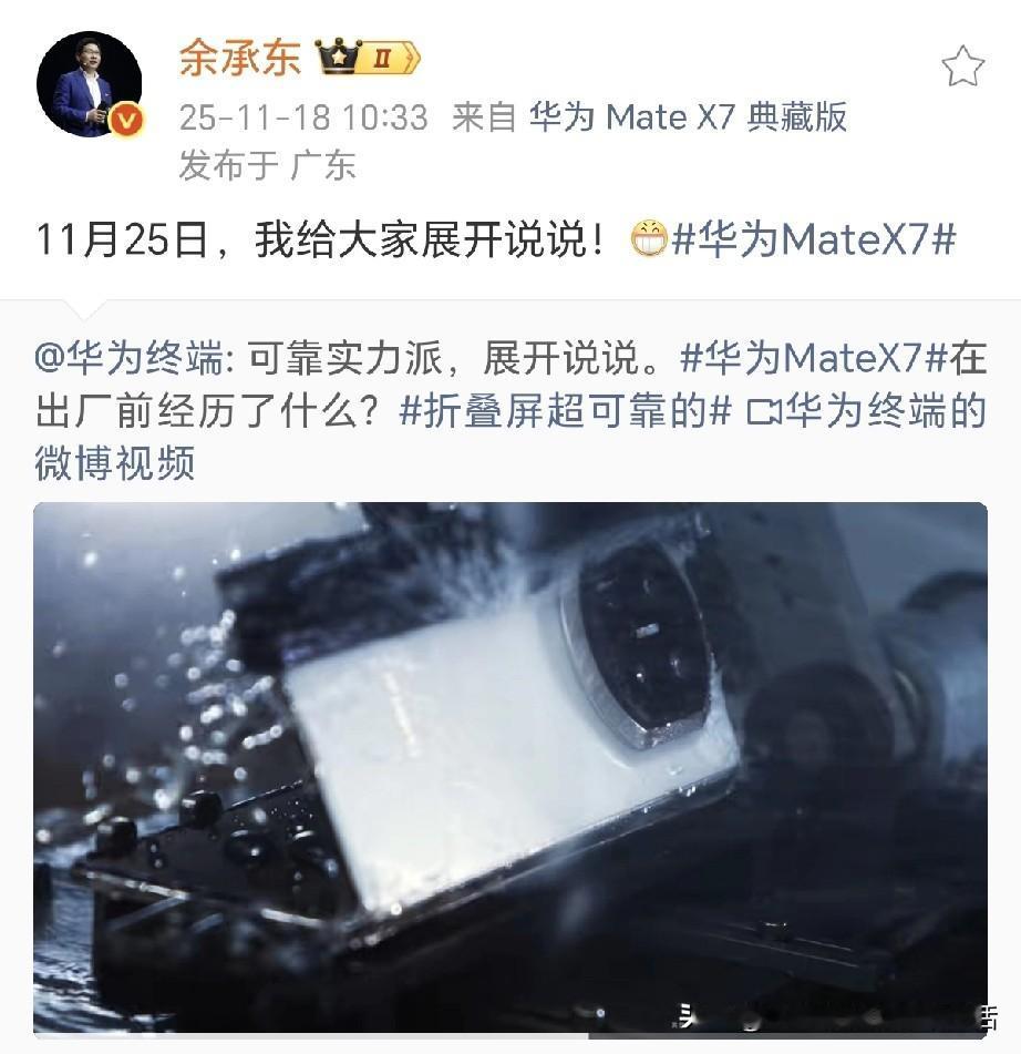 刚刚余承东亲自确认了! 11月25日下午两点半,余承东将给大家展开说说华为MateX7, 华为发视频官宣可靠实力派华为MateX7在出厂前经历了什么?1,80℃热水里IPX9测试!2,80.2℃高温测试!3,高强度机械折叠测试!4,边折叠边浇水测试! 非常震撼!华为Mate X7向大家展示了超强的产品力!对得起那四个字! 网友表示带着华为Mate X7不光可以泡澡,泡温泉也可以了,不过大多数网友非常期待余总能展开说说芯片! 你们怎么看?