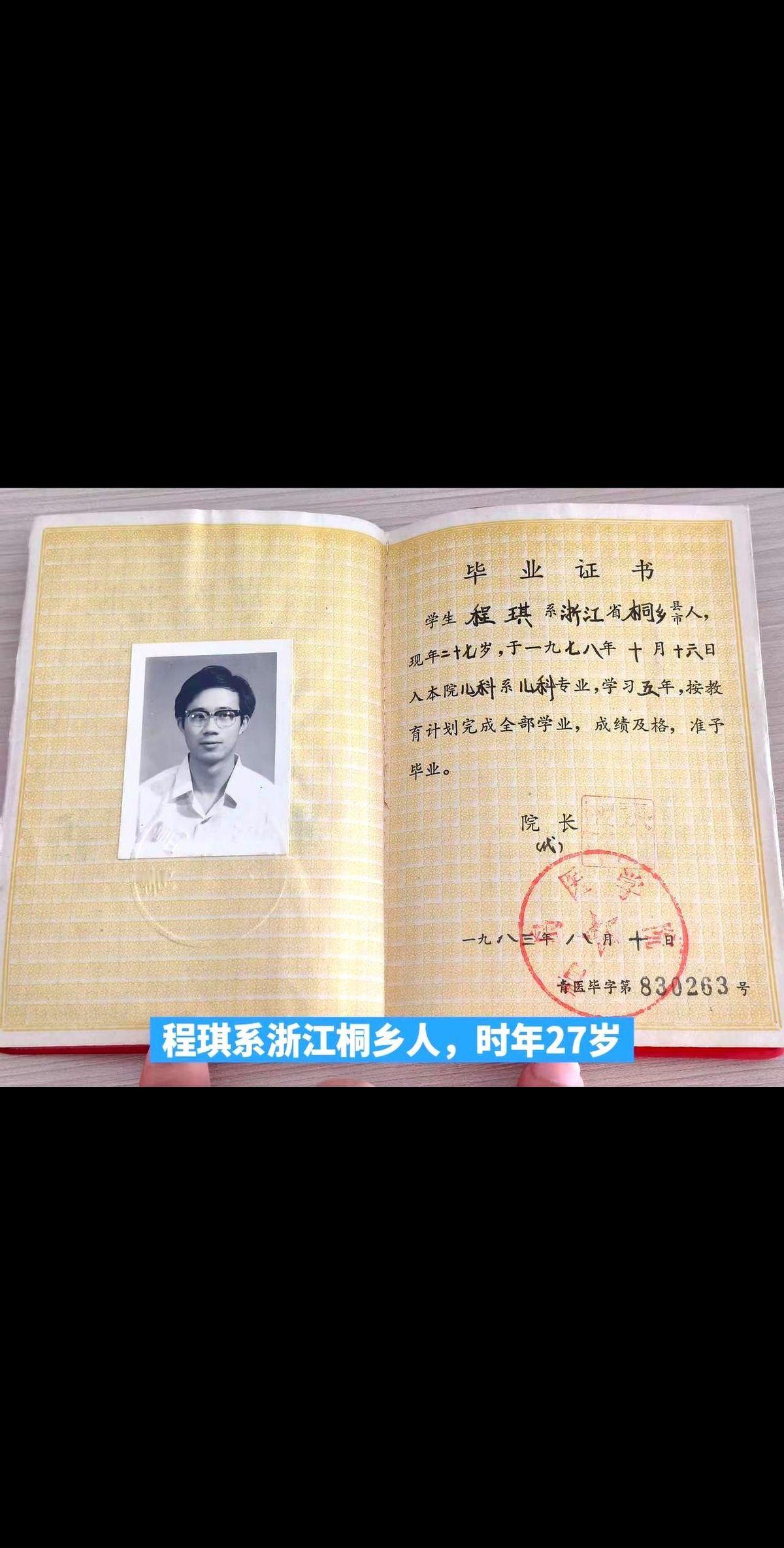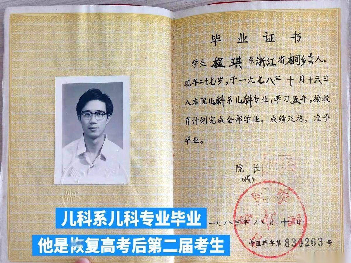 刷到一张1983年的毕业证,我人直接麻了。 主人叫程琪,浙江人。 重点是,他1978年考上的大学。 1978年,什么概念? 610万人报考,只录取40万。录取率,6.59%。 你品,你细品。 这哪是考试,这是千军万马过独木桥,能挤过去的,都是狠人。 一个浙江小伙,就这么考到了青岛医学院,读了最苦最累的儿科。 五年。 毕业后,他去了青岛儿童医院,成了一名儿科大夫。 我仿佛都能看见,一个年轻的医生,从此就把自己的一辈子,交给了那些孩子的哭声、笑声,和家长们焦急又感激的眼神里。 一张纸,真的很轻。 但这张纸,是一个人搏上整个青春换来的入场券,也是他奉献一生的起点。 不知道程琪医生现在在哪儿,过得怎么样了。 但这张泛黄的纸,已经替他把故事讲得明明白白。 有些人,光是看到他的履历,就值得一个敬礼。