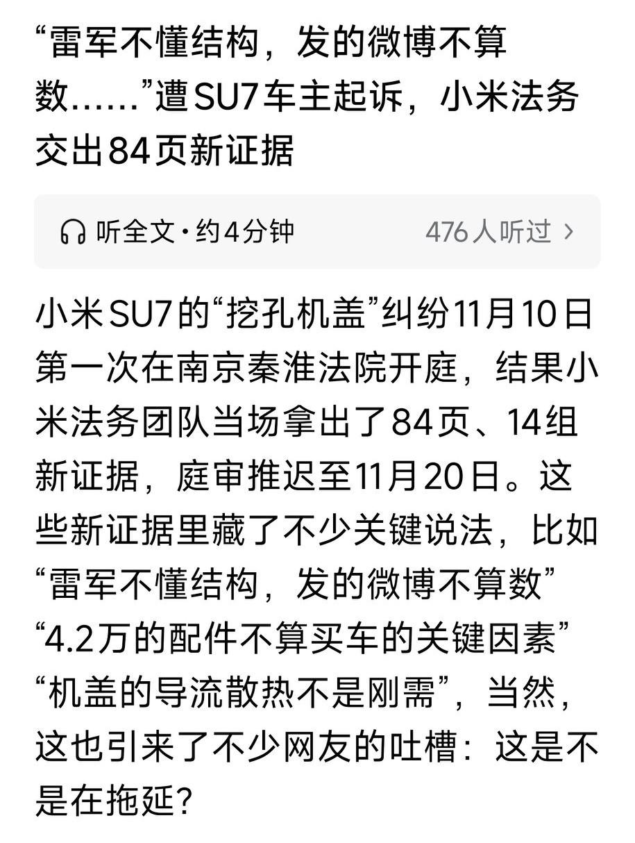 “雷军不懂结构,发的微博不算数”遭SU7车主起诉,小米法务提交84页新证据。这不禁引人深思,在微博上是否人人都能信口雌黄、无需担责?照此推断,网络空间里大家都能随意发言而不必负责吗? 国家早有明确规定,网络并非法外之地,每个人都要为自己的言论负责。 倘若名人在网上的言论无需担责,那老百姓就没必要听,官方媒体也不能引用他们的话作为论述证据。 雷军常为自家产品在网络上发声,本质就是为产品打广告。若他在微博上说的话不作数,我个人认为后果不堪设想。 对此你怎么看?