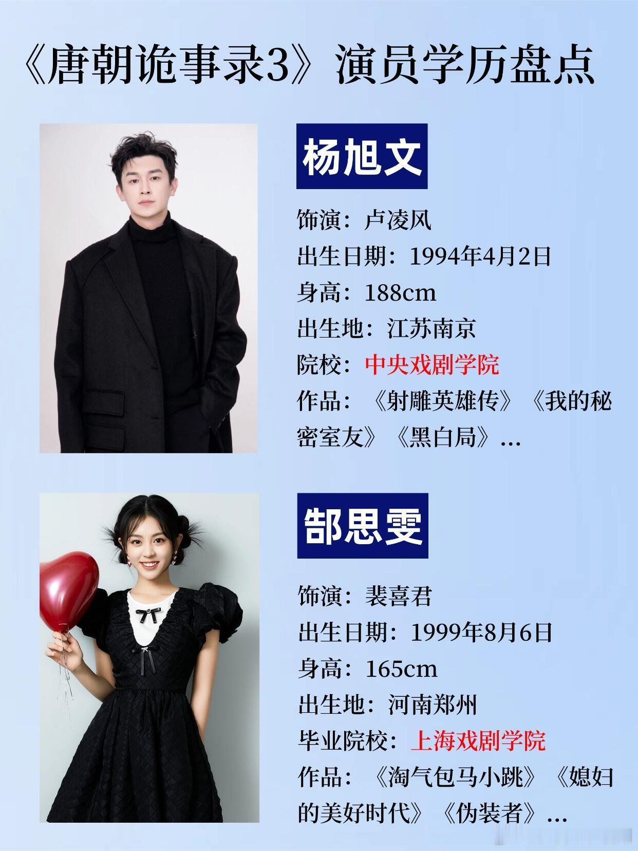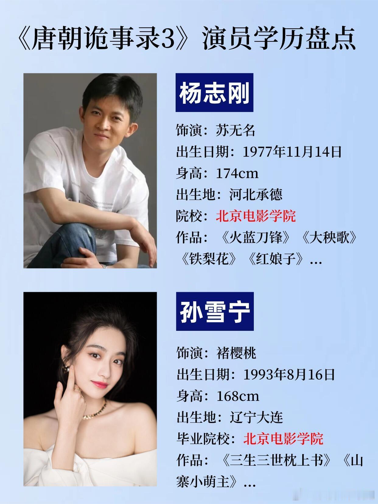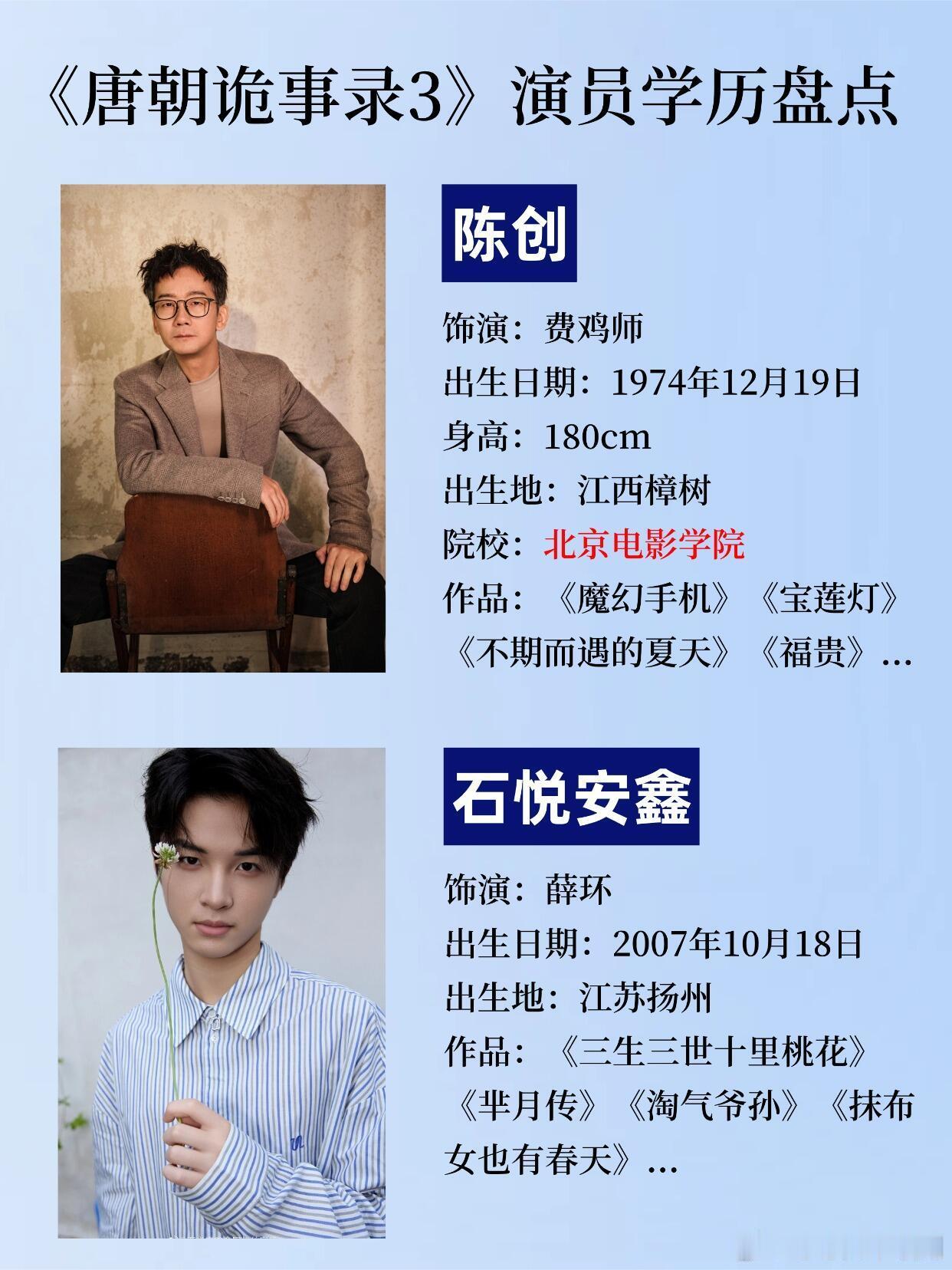 唐诡全员科班出身就是有看头!!!“文艺工作者一定要有文化”这句话的含金量还在上升,仔细看你会发现唐诡的主演都是本科院校毕业!从唐诡1到唐诡3,真的能感受到演员们的实力,还有导演编剧以及幕后的工作人员的用心,剧情反转反转再反转,尊重历史,道具还原。比如:杨旭文以全国前五的成绩,考入中央戏剧学院表演系本科班;大三时与华谊兄弟签约,成为旗下艺人。杨志刚14岁时进入艺校学习跳舞,20岁被选中参加1998年虎年春晚舞蹈组,在哥哥郭靖宇的建.议下,考入北京电影学院。陈创出身演艺世家,自幼学习戏曲,获第21届北京大学生电影节最佳低成本电影男演员、第14届电视电影百合奖优秀男演员奖唐朝诡事录‖