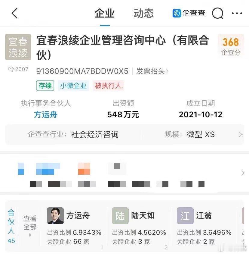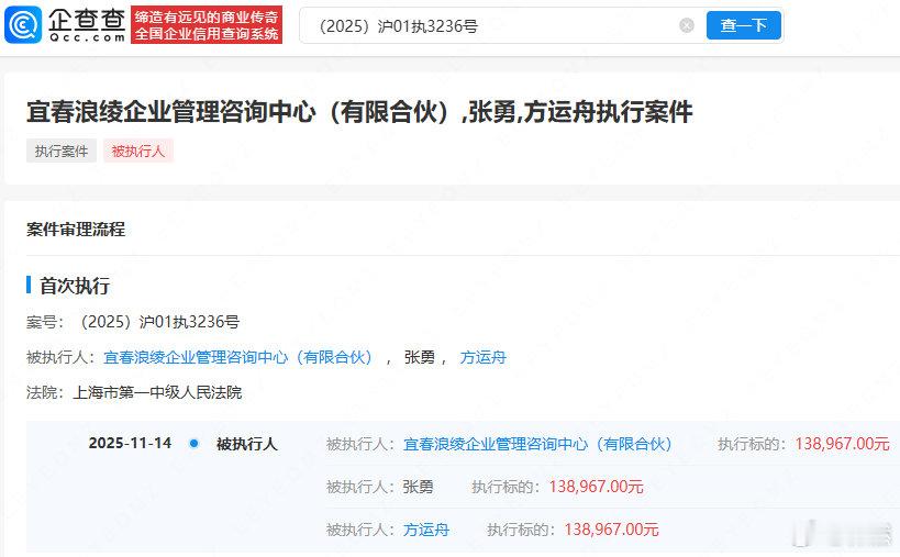 【哪吒汽车张勇被强执】 企查查APP显示,近日,哪吒汽车方运舟、张勇及宜春浪绫企业管理咨询中心(有限合伙)新增两则被执行人信息,执行标的合计36.5万余元,执行法院为上海市第一中级人民法院。企查查显示,宜春浪绫企业管理咨询中心(有限合伙)成立于2021年10月,执行事务合伙人为方运舟,出资额548万元。合伙人信息显示,该咨询中心由方运舟、张勇等40余位合伙人共同出资。
